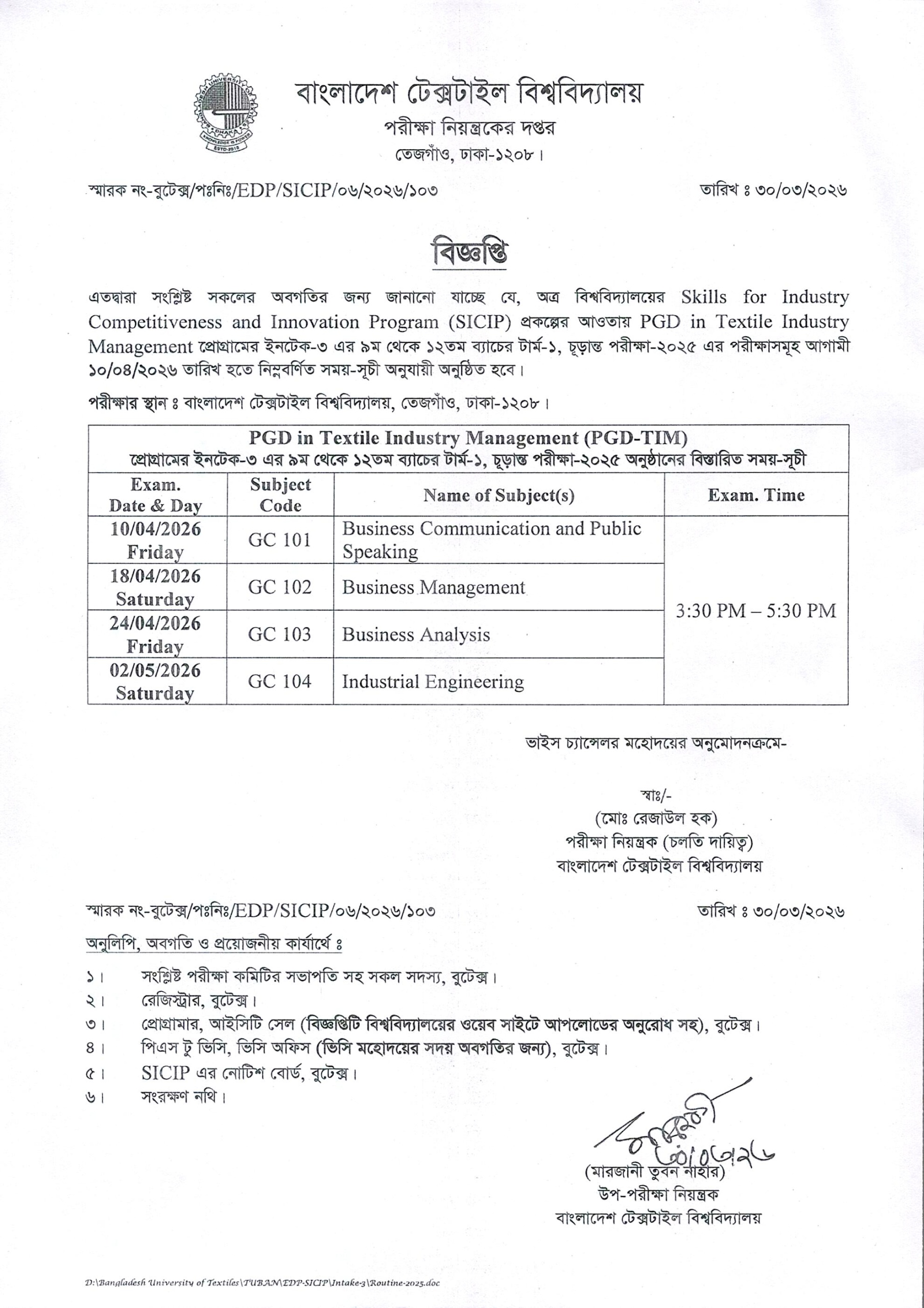 01 Apr 2026 Examination Schedule-2025 of Batch (9, 10, 11, 12) PGD in Textile Industry Management (Intake-3) Academic Notices, Executive Development Program News