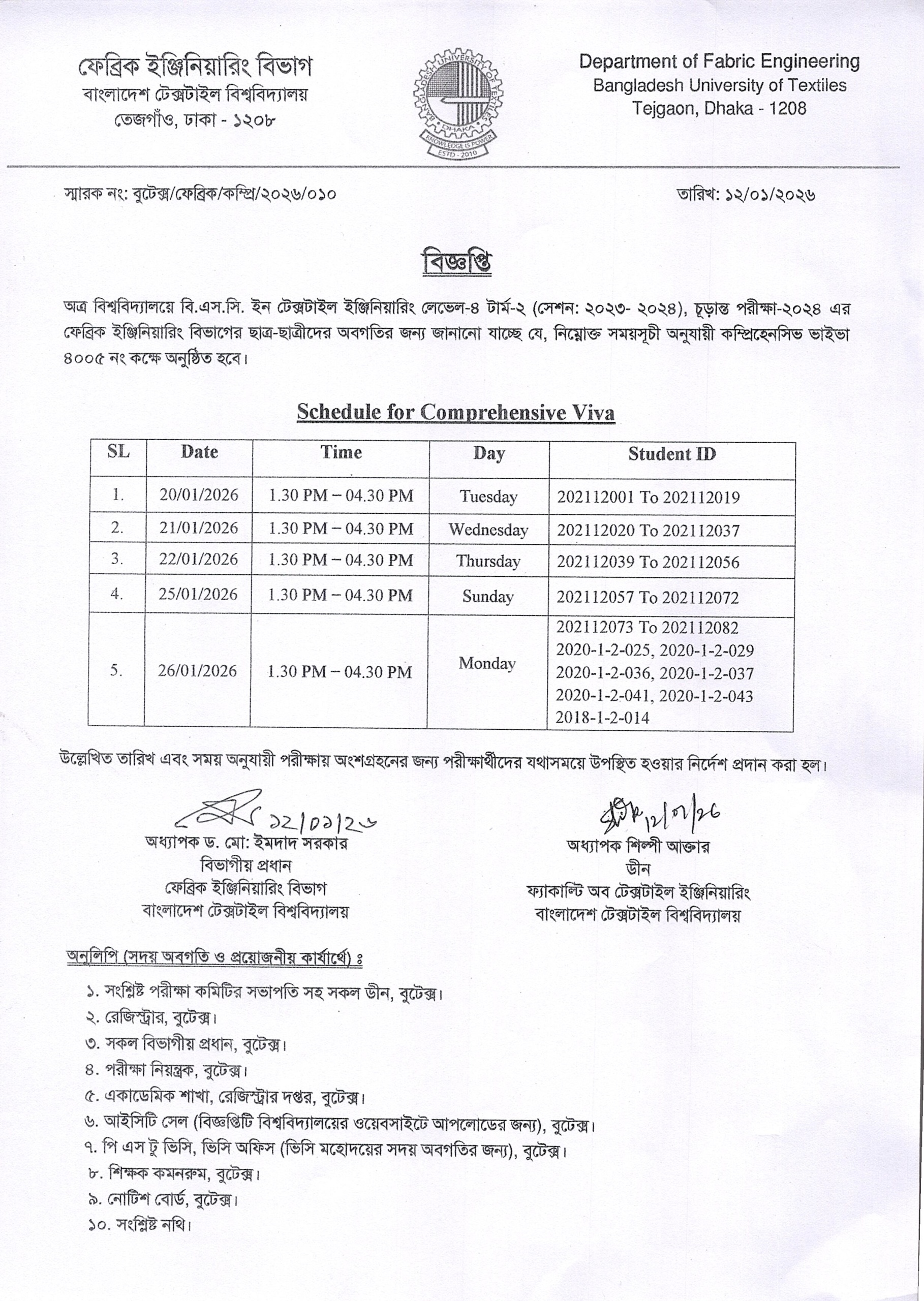 22 Jan 2026 Fabric Dept. Industrial Attachment & Comprehensive Viva of BSc in Textile Engineering L-4 T-2 Academic Notices, DFE, Undergrade Admission News