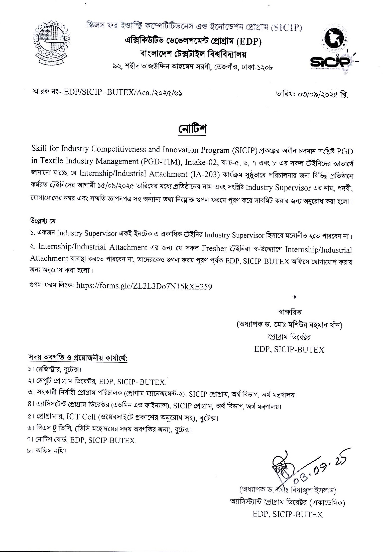 Internship/Industrial Attachment Notice of PGD-TIM (Intake-2) Batch 5, 6, 7, 8