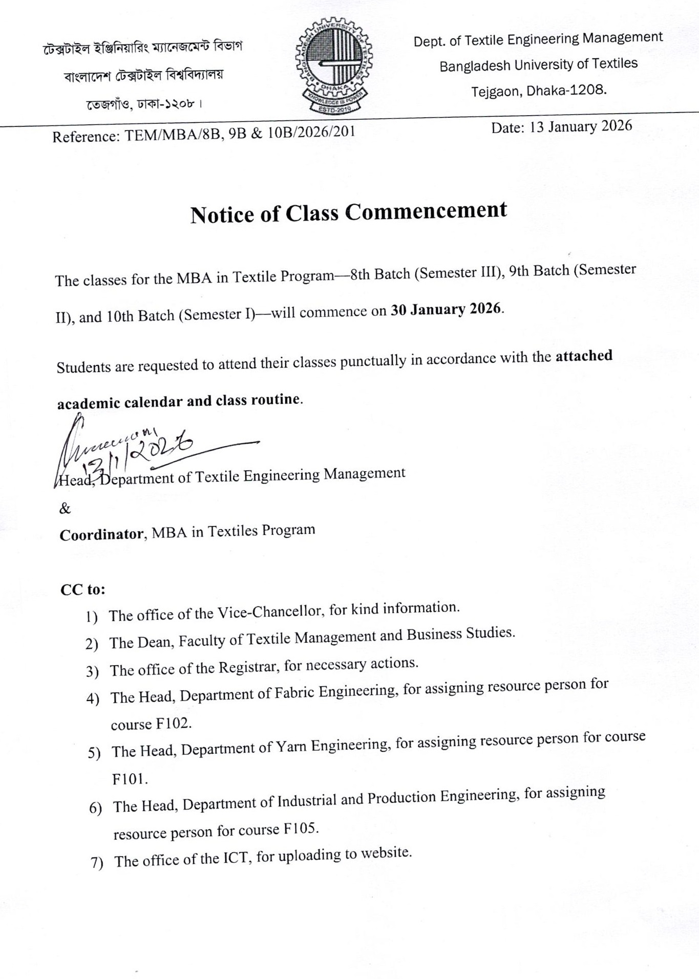 14 Jan 2026 MBA Class Commencement Notice Jan-Jun 2026 Academic Notices, DTEM, Postgraduate Admission News