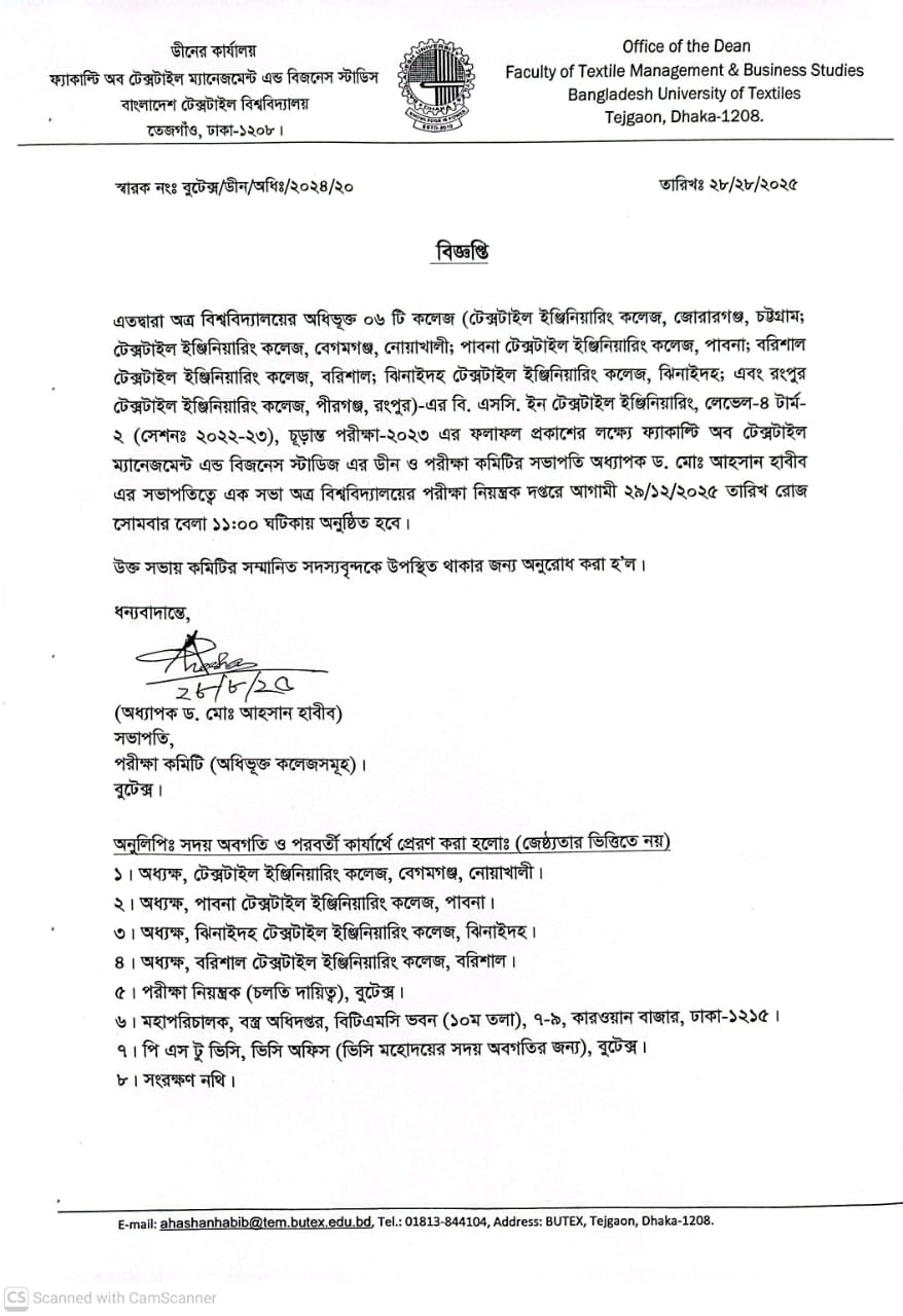 28 Dec 2025 Meeting Notice: Affiliated Colleges of BSc in Textile Engineering L4-T2 Exam: 2023 Affiliated Colleges News