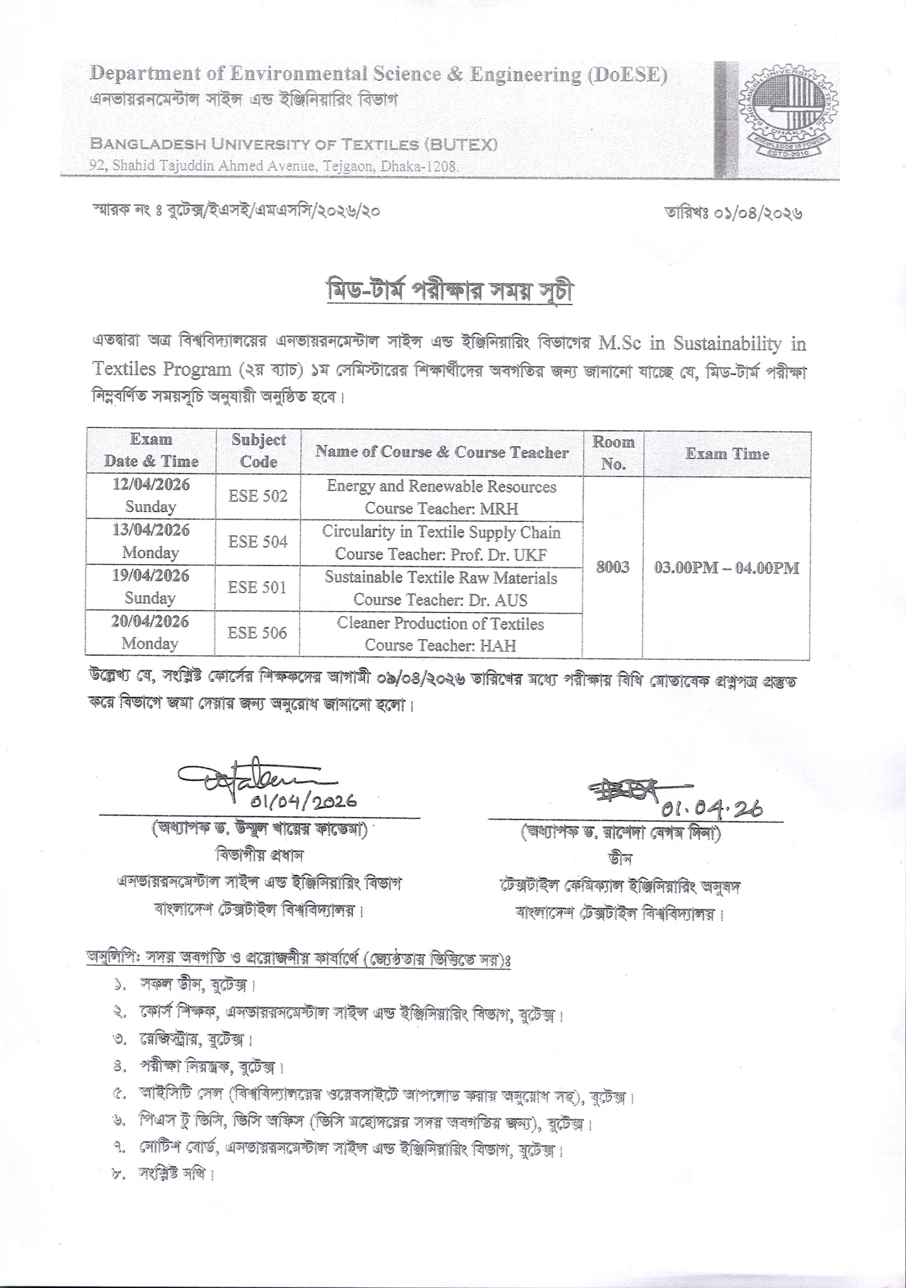02 Apr 2026 Mid Term Exam Routine of MSc in Sustainability in Textiles Program (ESE Dept.) 2nd Batch 1st Semester Academic Notices News