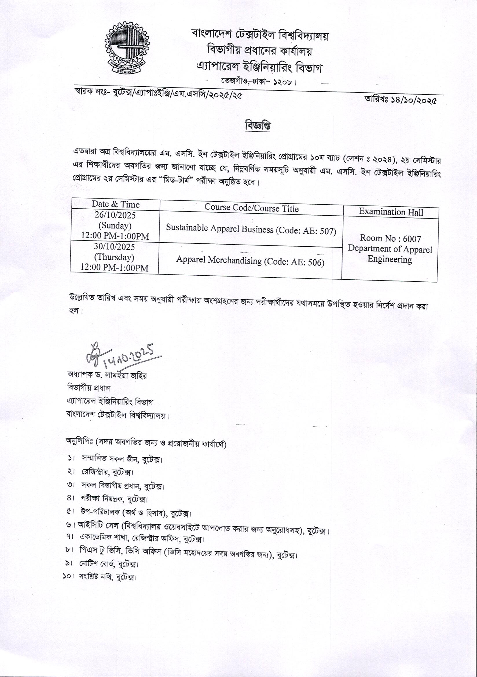 14 Oct 2025 Mid Term Exam Routine of MSc in Textile Eng. (Apparel) 10th Batch 2nd Semester Academic Notices, DAE, Postgraduate Admission News