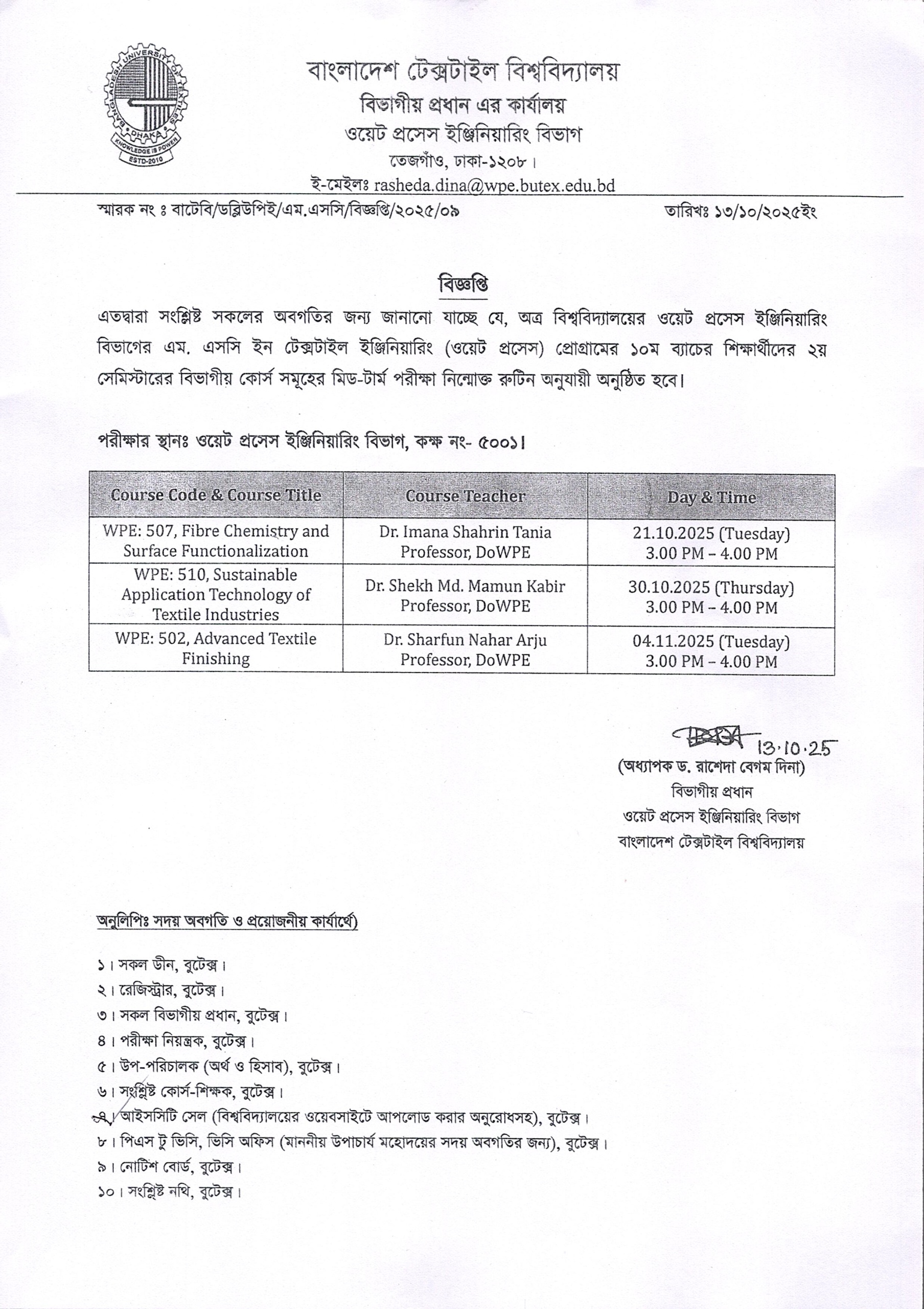 • Mid Term Exam Routine of MSc in Textile Eng. (Wet Process) 10th Batch 2nd Semester October 13, 2025