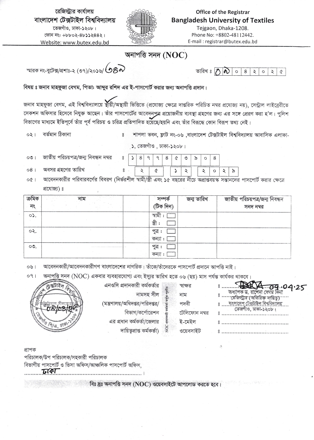 NOC: Mahfuza Begum, Section Officer, Central Library