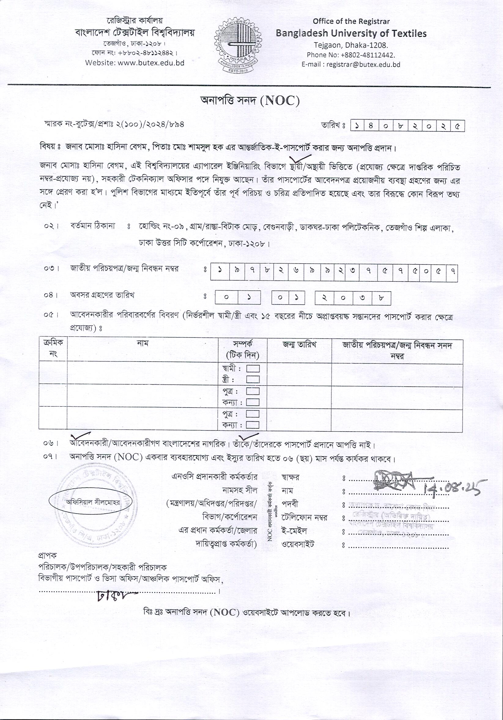 NOC: Mst. Hasina Begum, Assistant Technical Officer