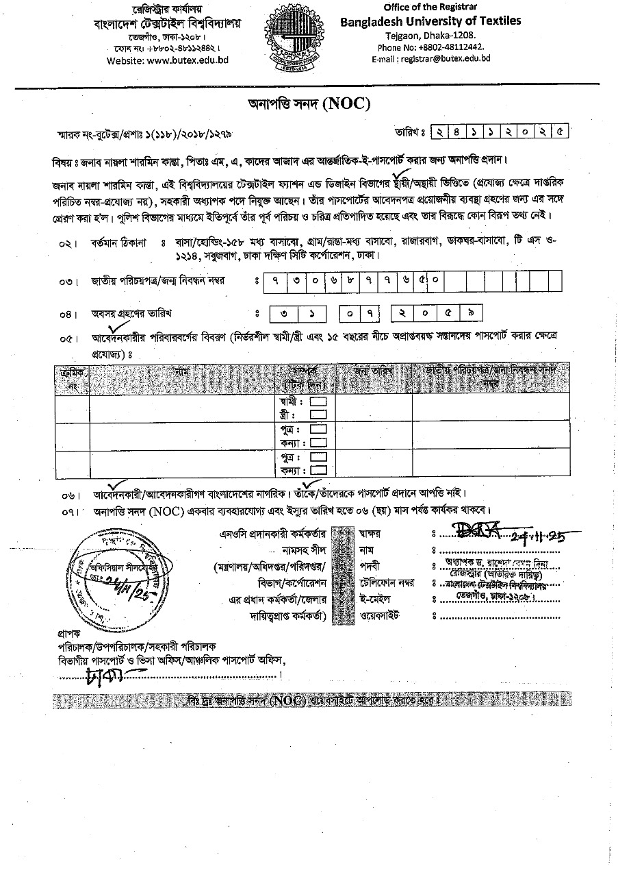 NOC: Naila Sharmin Kanta, Assistant Professor, DoTFD
