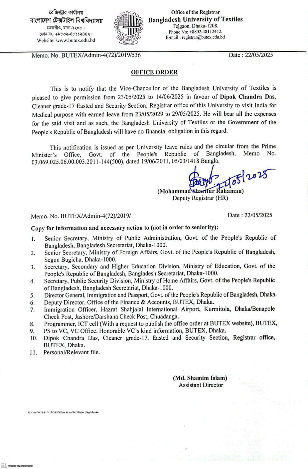 22 May 2025 Office Order: Dipok Chandro Das, Cleaner Grade-17, State and Security Section, Register Office. NOC_GO News