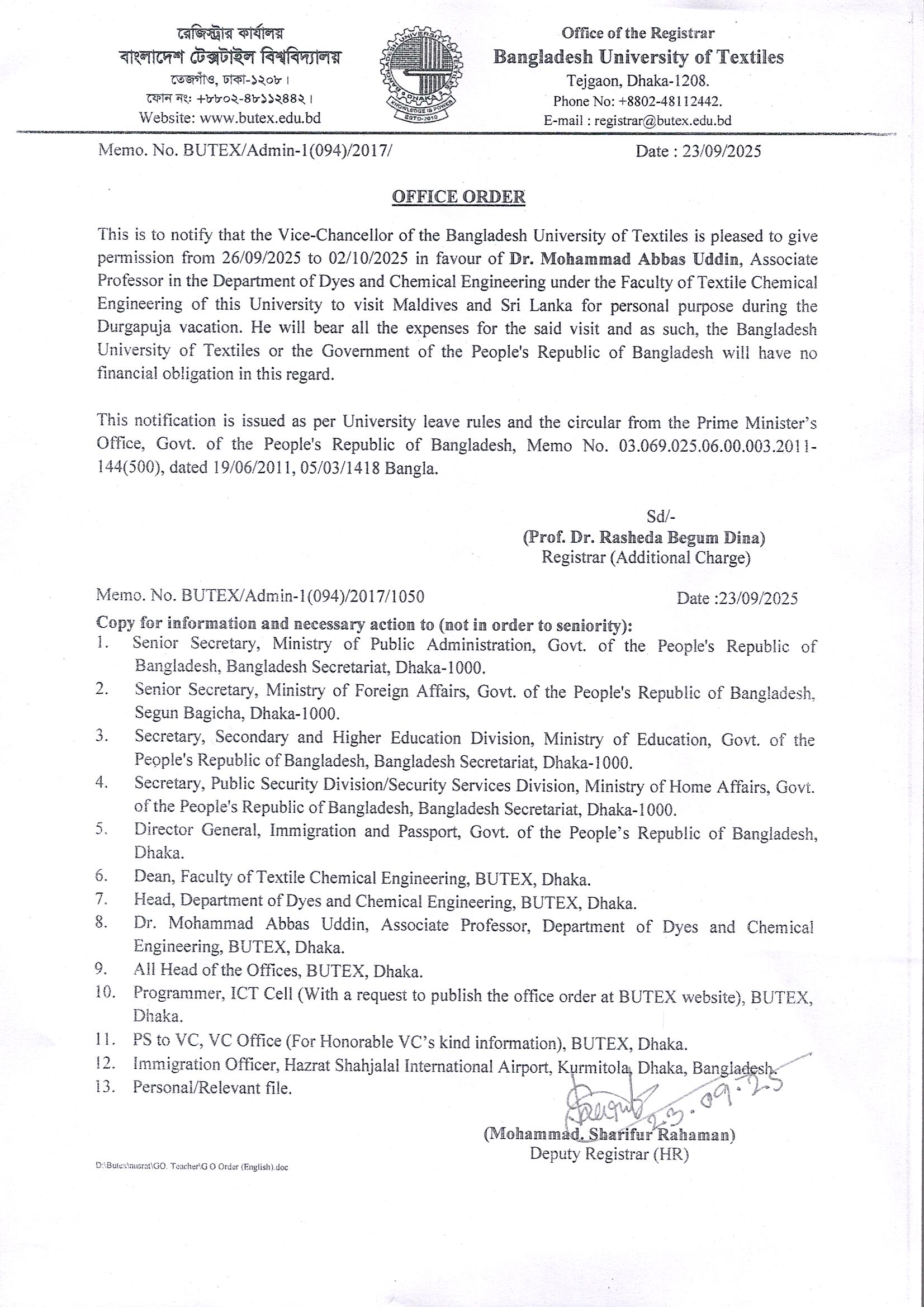 Office Order: Dr. Mohammad Abbas Uddin Shiyak, Associate Professor DoDCE