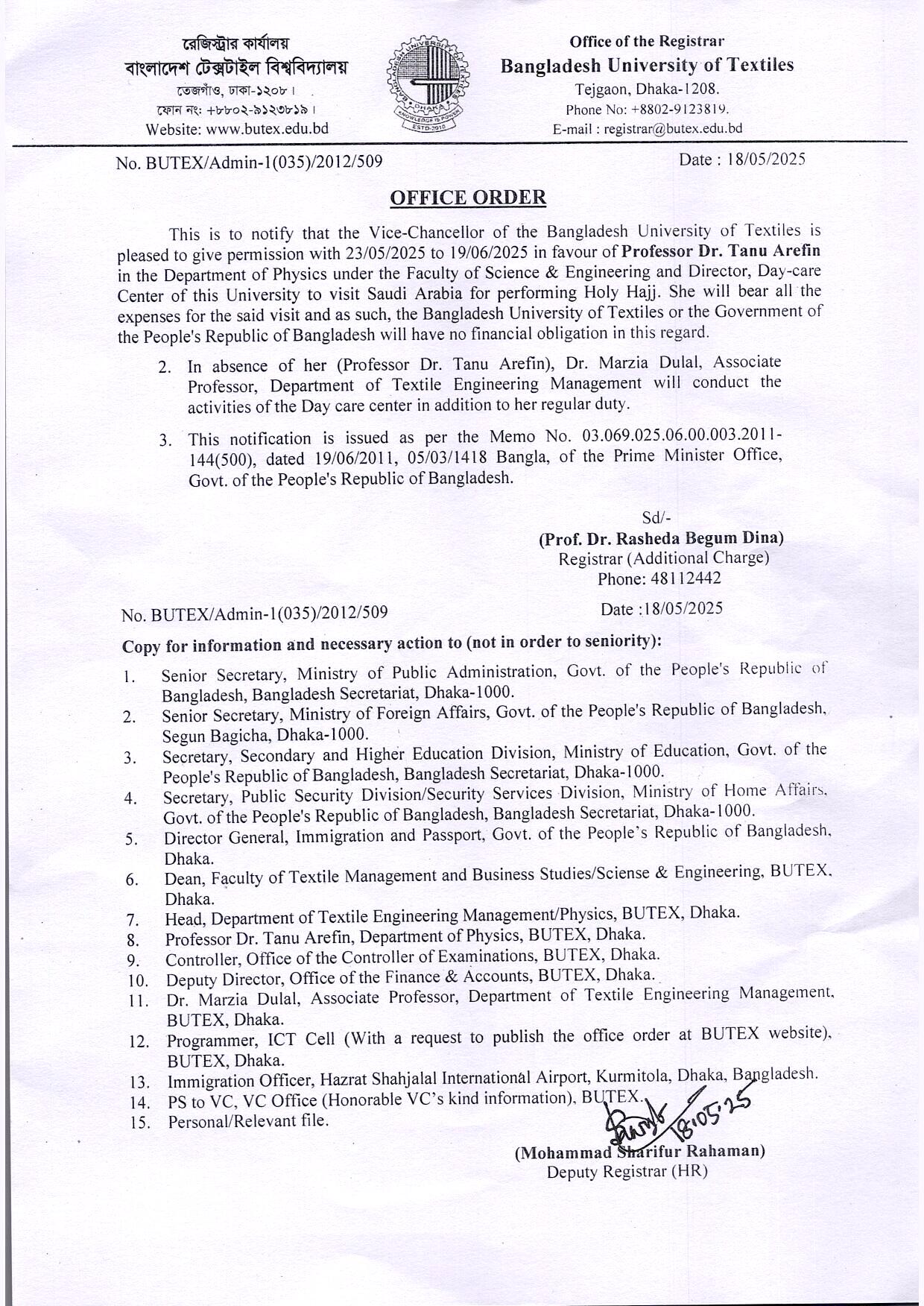 Office Order: Dr. Tanu Arefin, Professor, Department of Physics