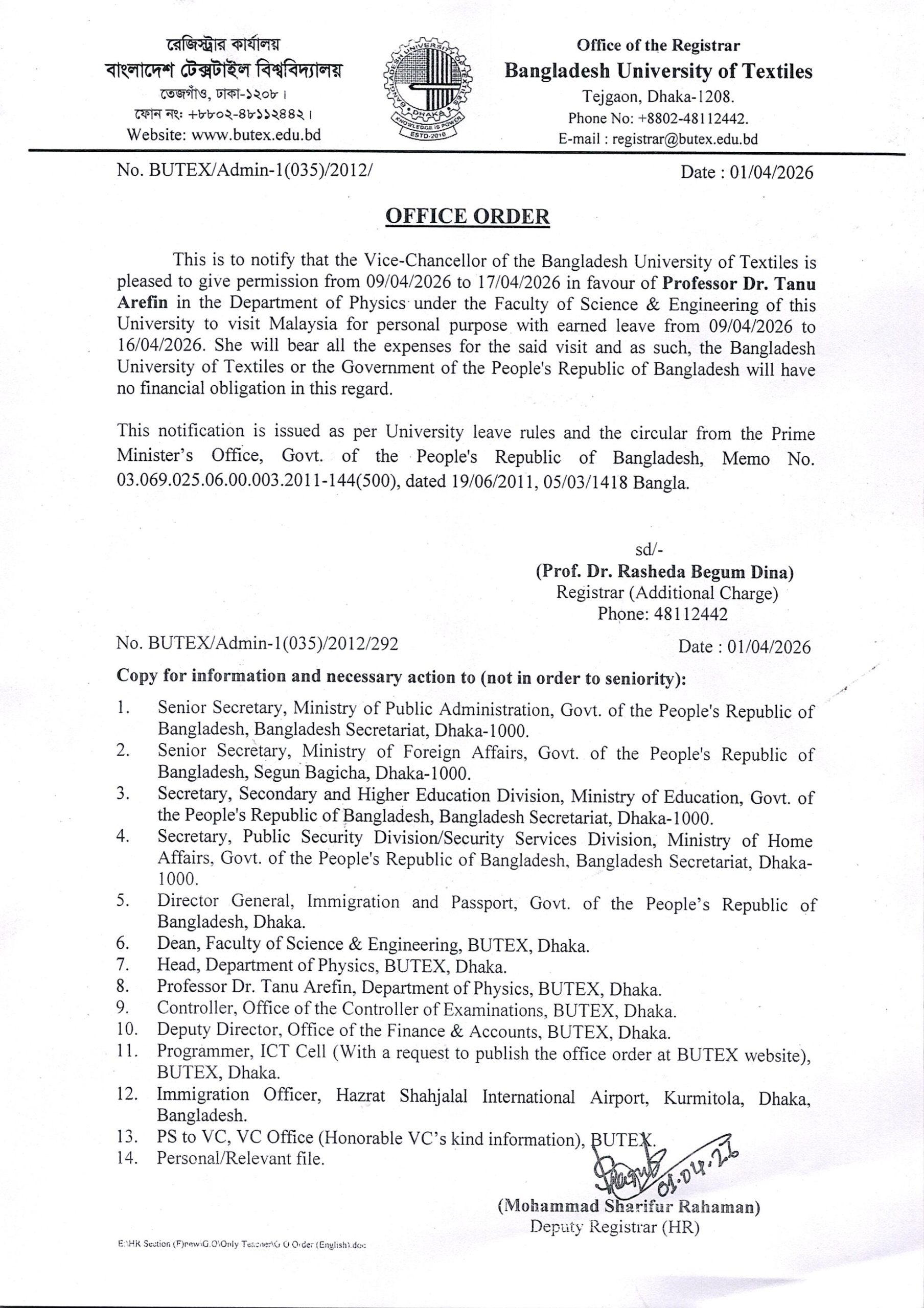 Office Order: Dr. Tanu Arefin, Professor DoPhysics