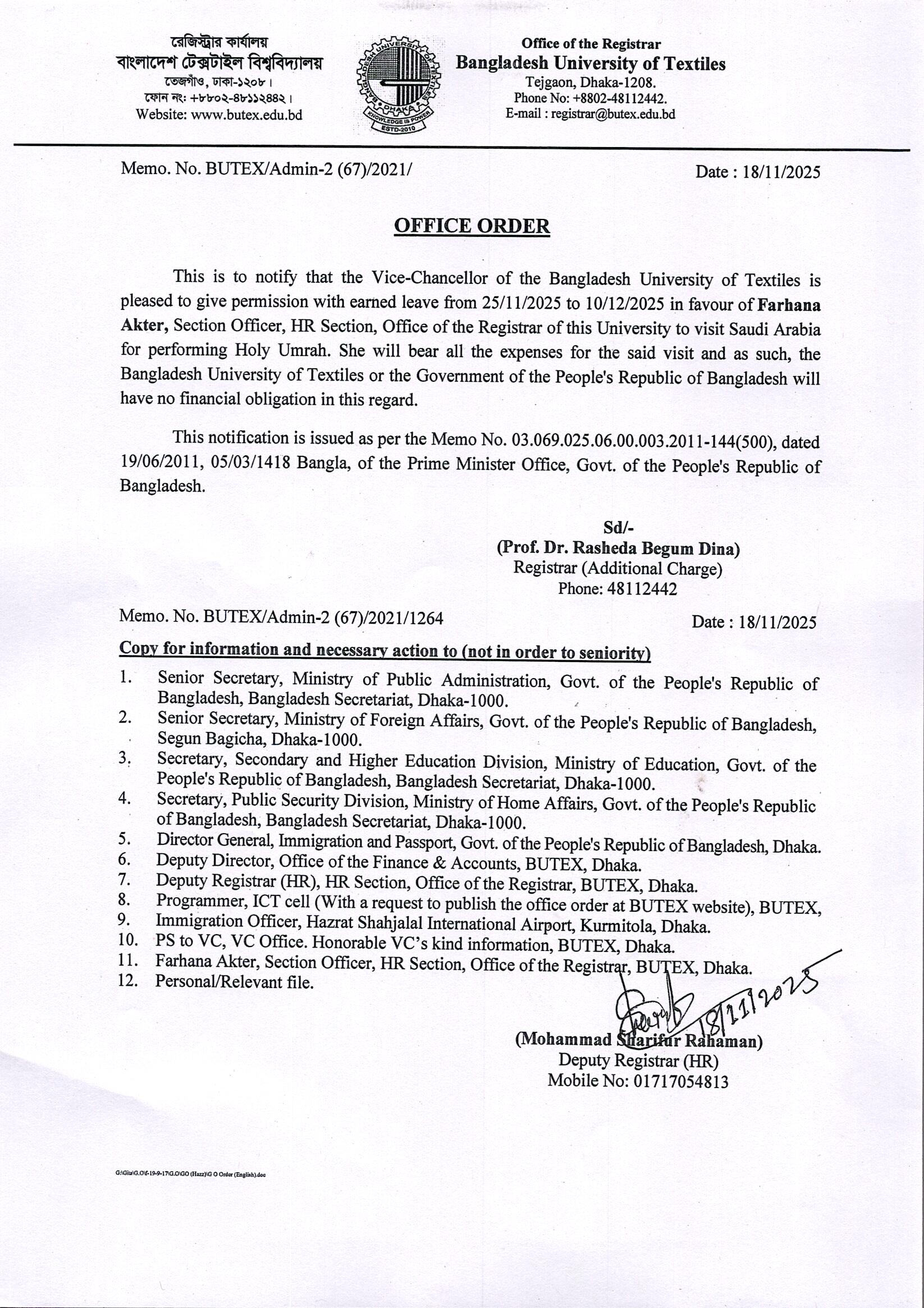 Office Order: Farhana Akter, Section Officer, Office of the Registrar