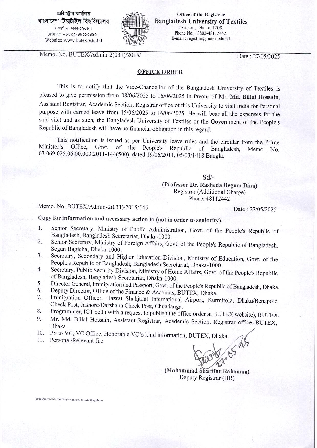 29 May 2025 Office Order: Md. Billal Hossain, Assistant Registrar, Academic Section, Registrar Office NOC_GO News