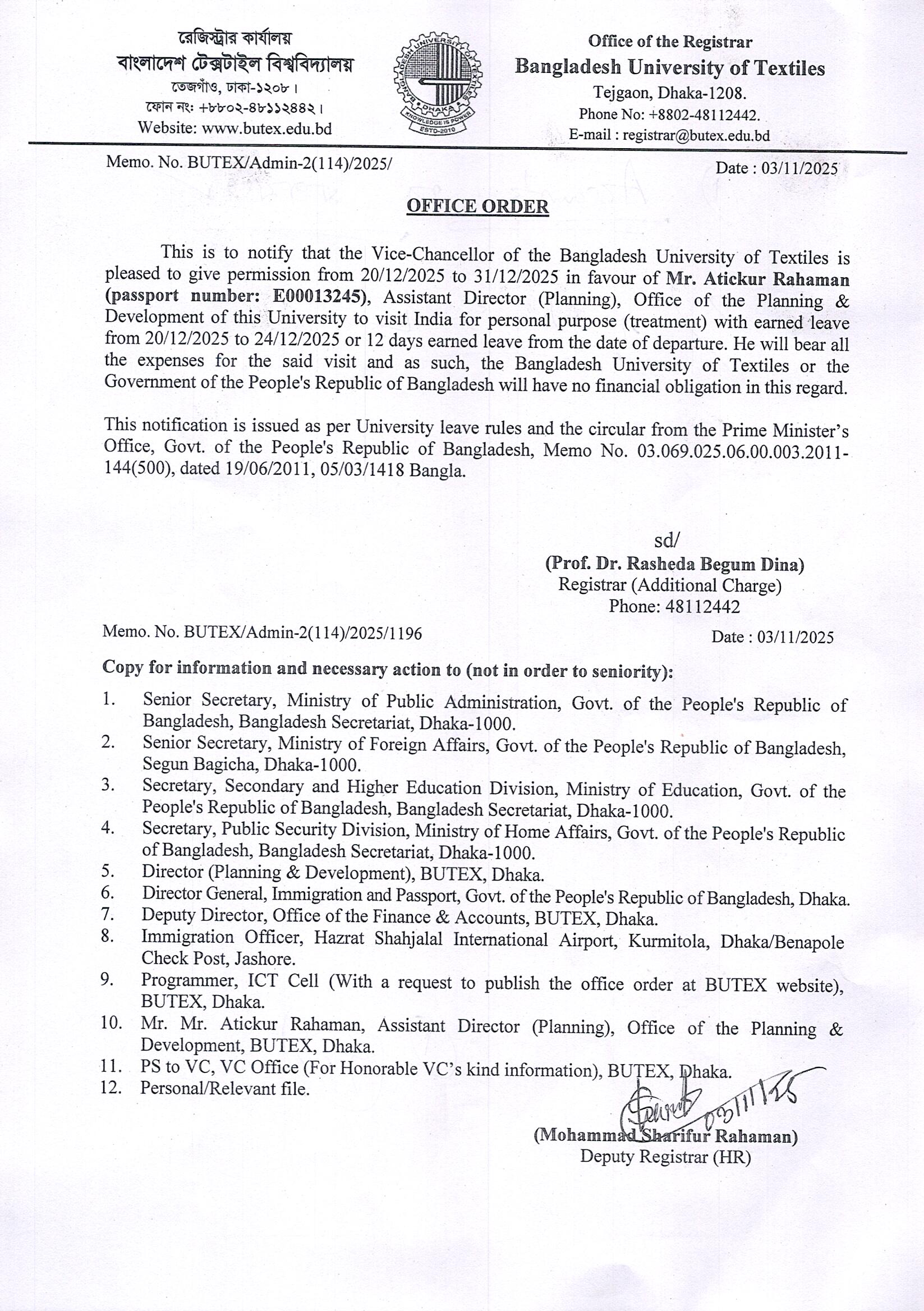 Office Order: Mr. Atickur Rahaman, Assistant Director (Planning)