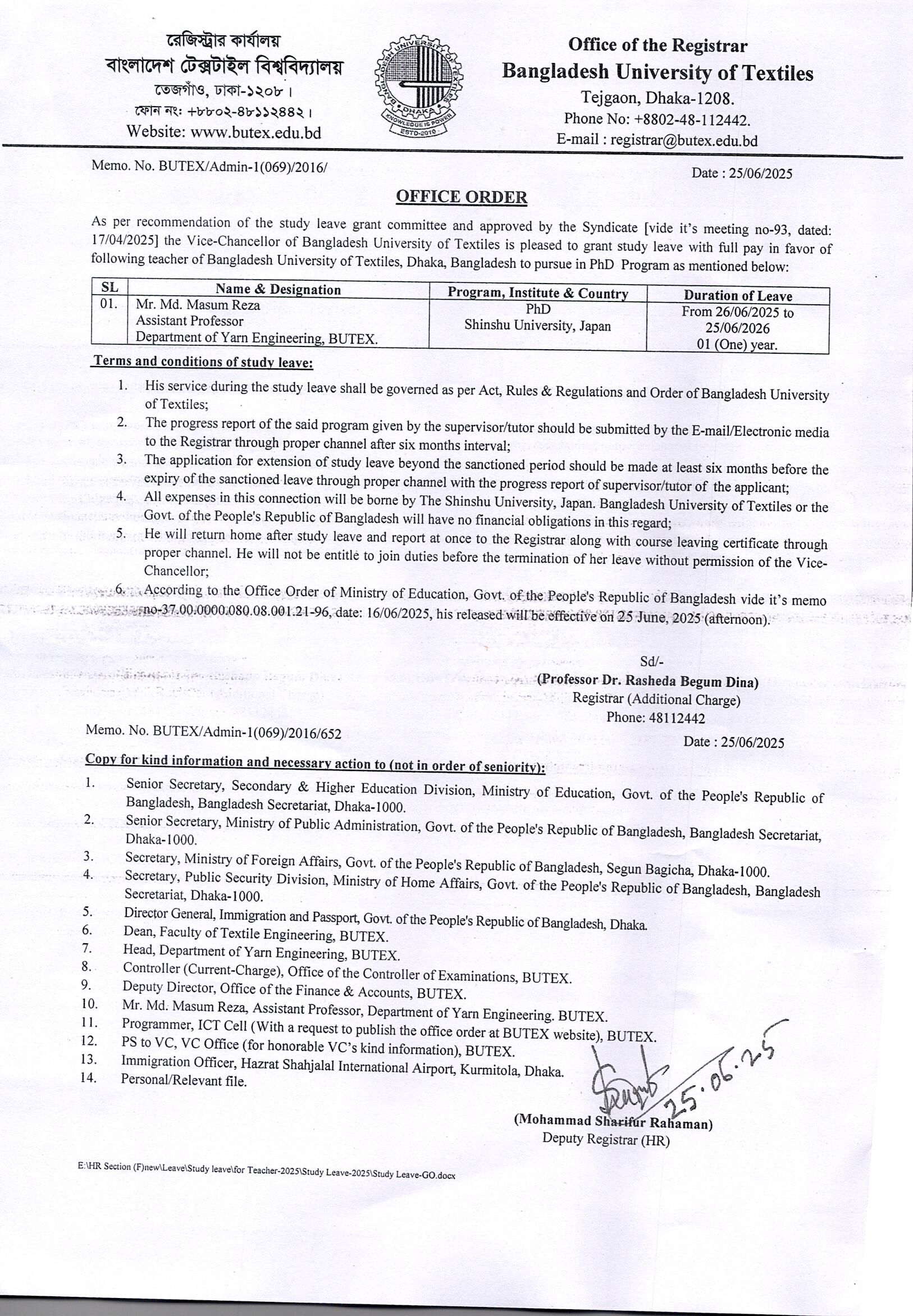25 Jun 2025 Office Order: Mr. Md. Masum Reza, Assistant Professor, Department of Yarn Engineering NOC_GO News