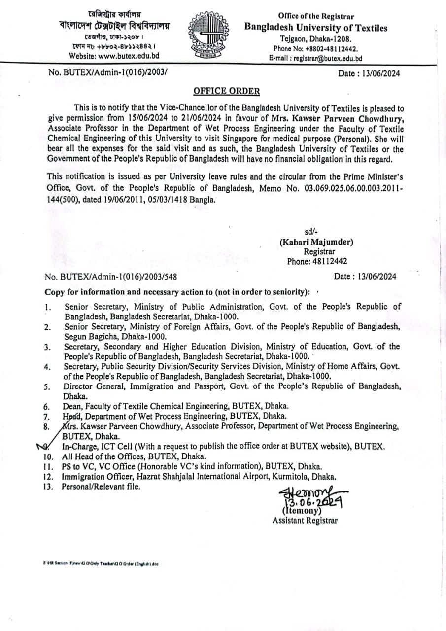 Office Order: Mrs. Kawser Parveen Chowdhury, Associate Professor DoWPE