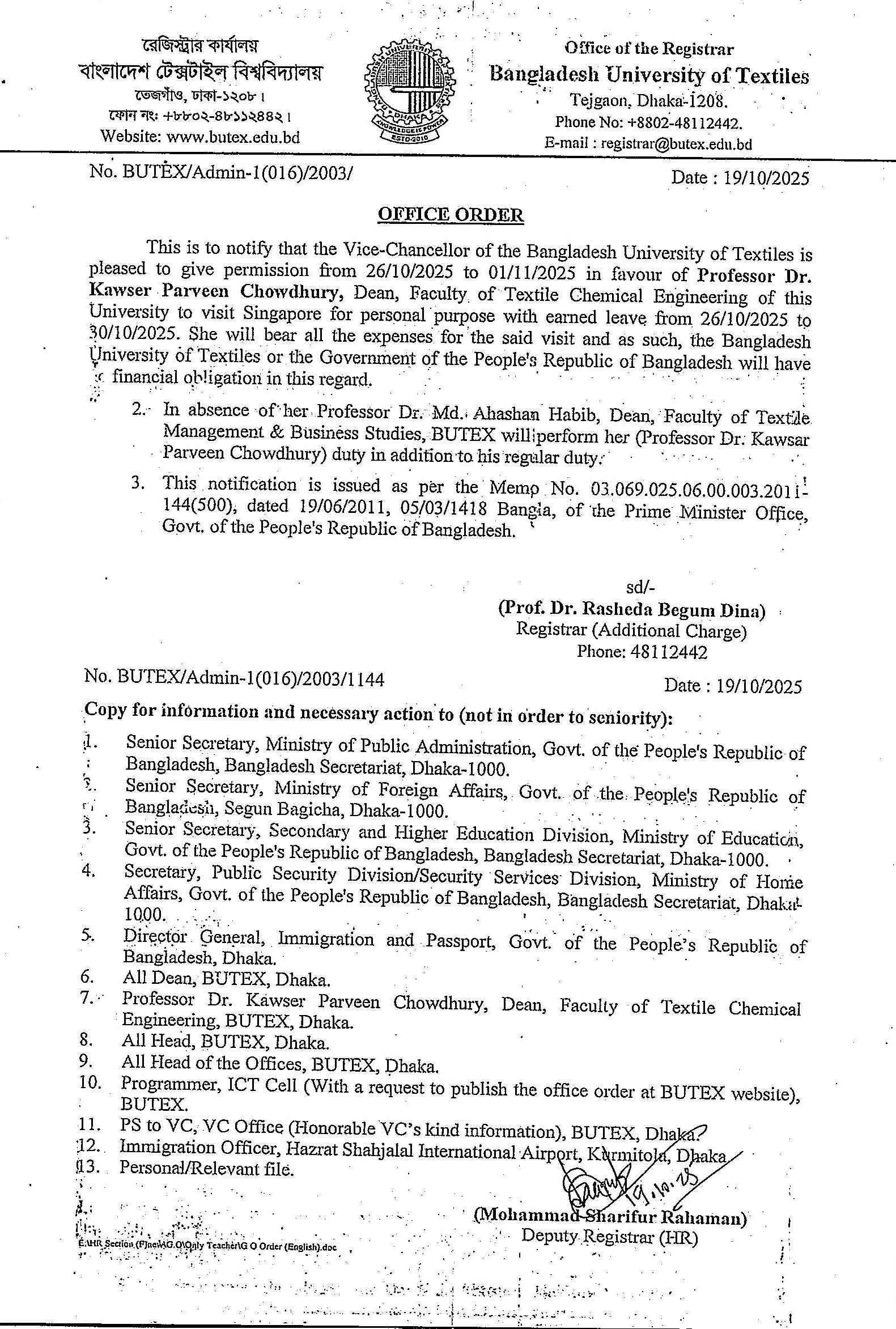 22 Oct 2025 Office Order: Professor Dr. Kawser Parveen Chowdhury, Dean, Faculty of Textile Chemical Engineering NOC_GO News
