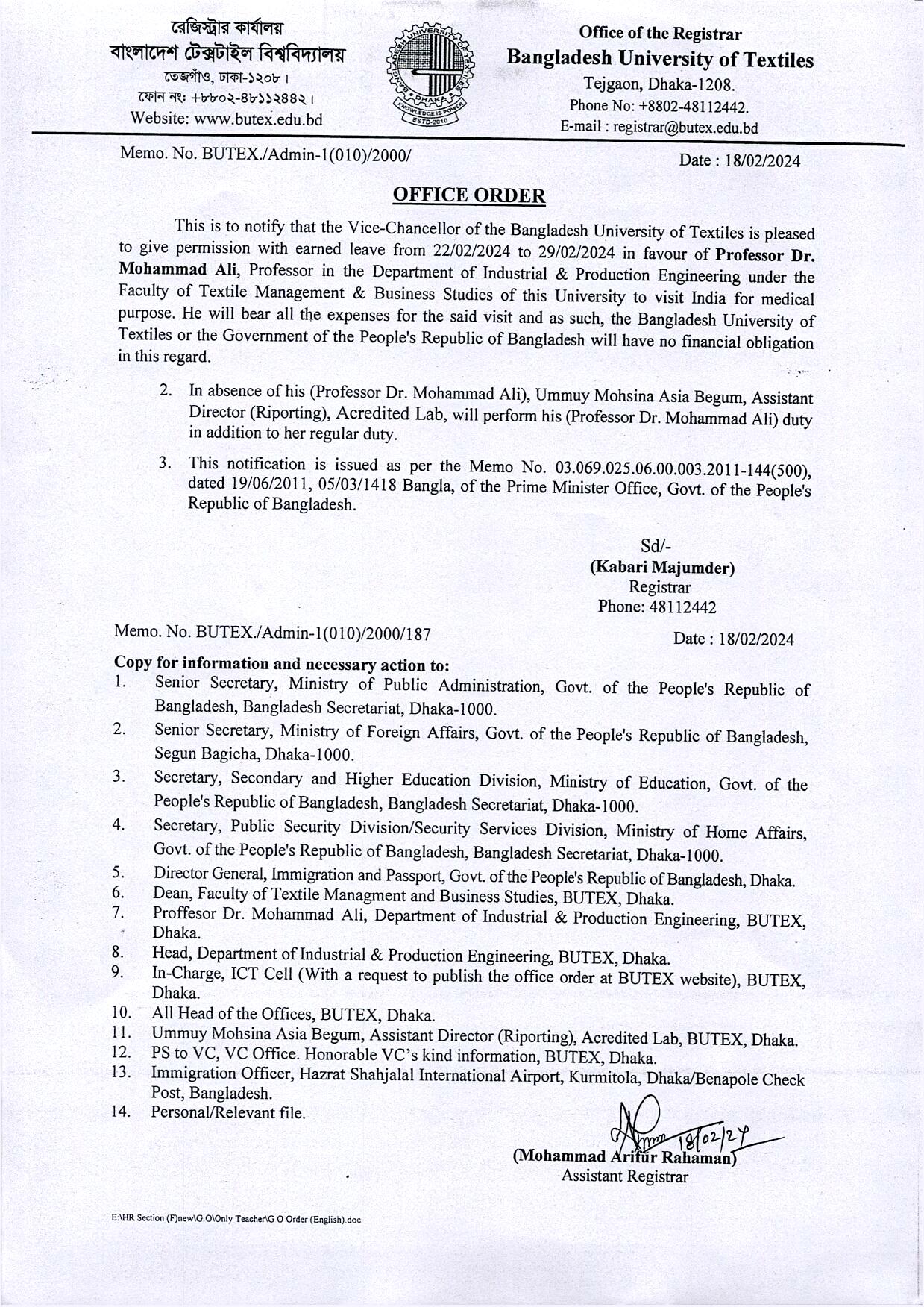 19 Feb 2024 Office Order: Professor Dr. Mohammad Ali, Department of Industrial and Production Engineering NOC_GO News