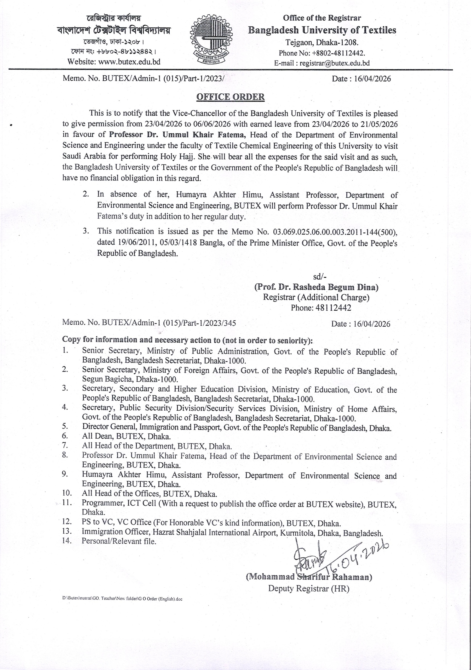 Office Order: Professor Dr. Ummul Khair Fatema, Head DoESE