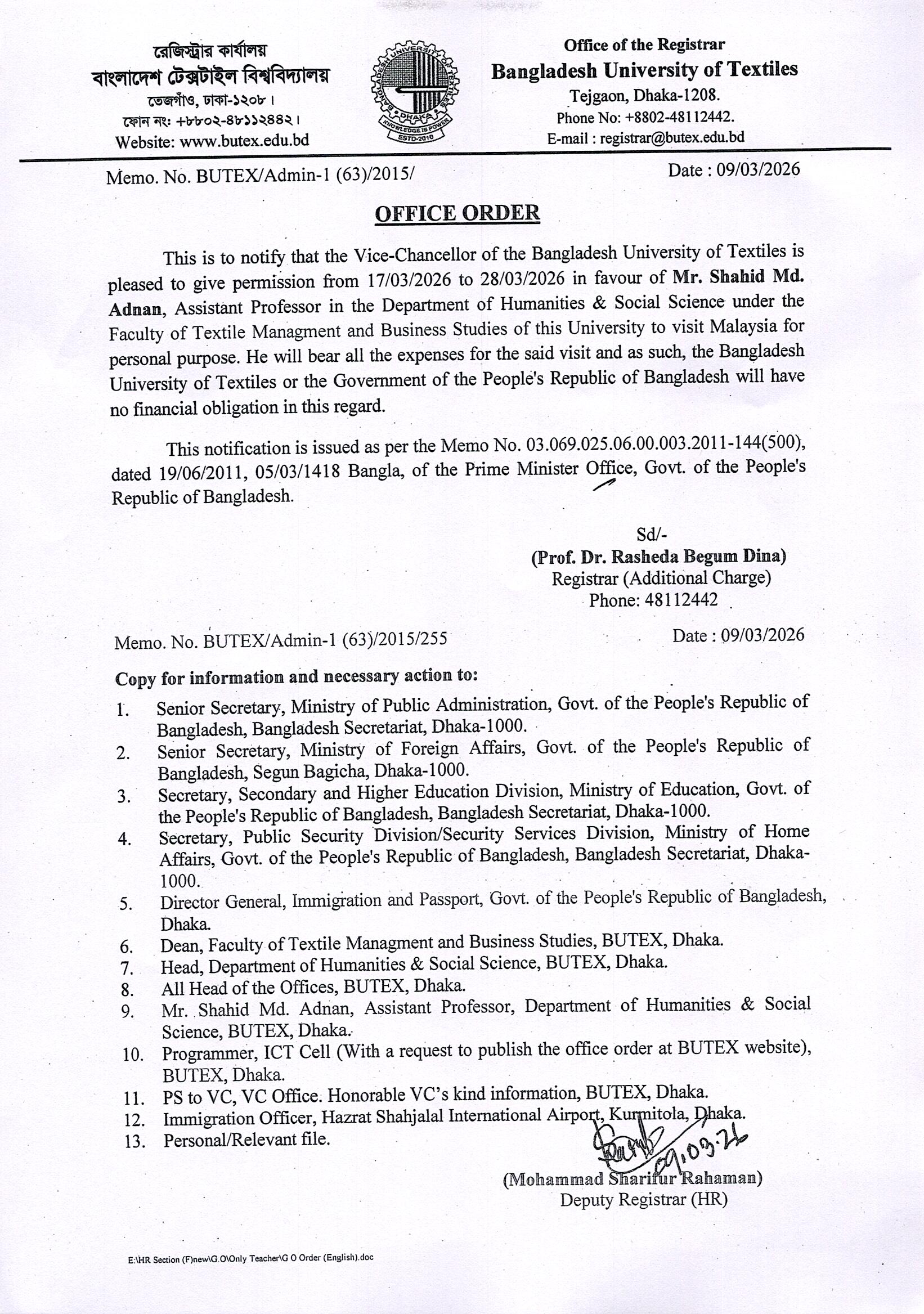 Office Order: Shahid Md. Adnan, Assistant Professor DoHSS