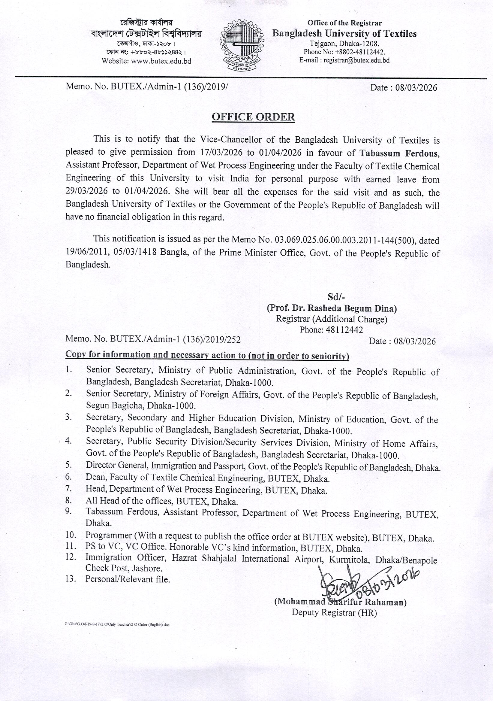 Office Order: Tabassum Ferdous, Assistant Professor DoWPE