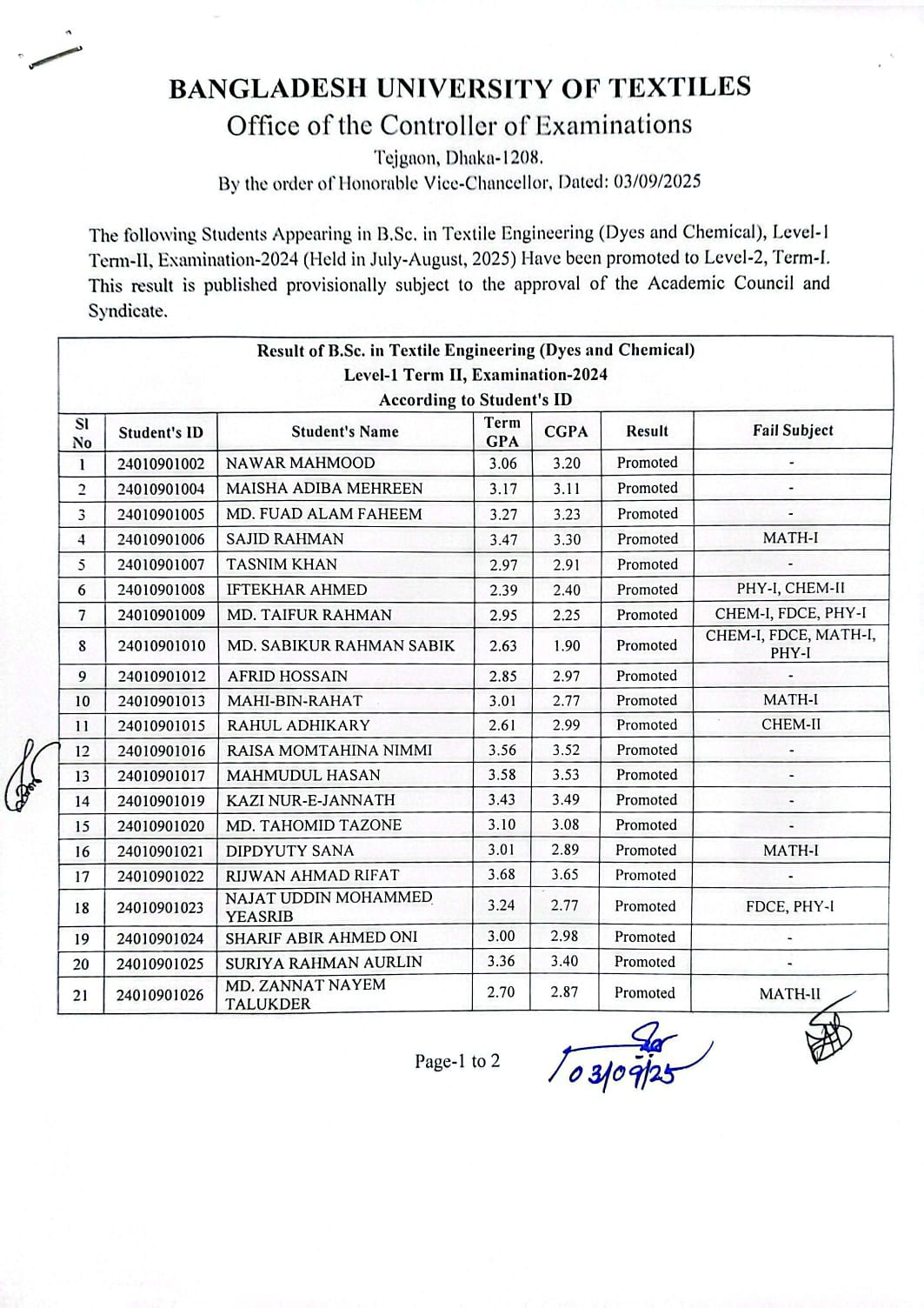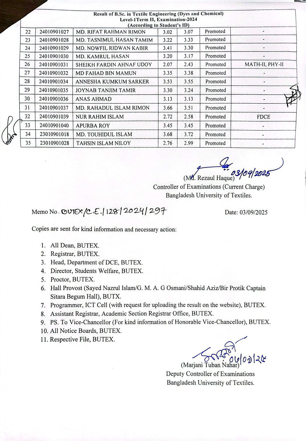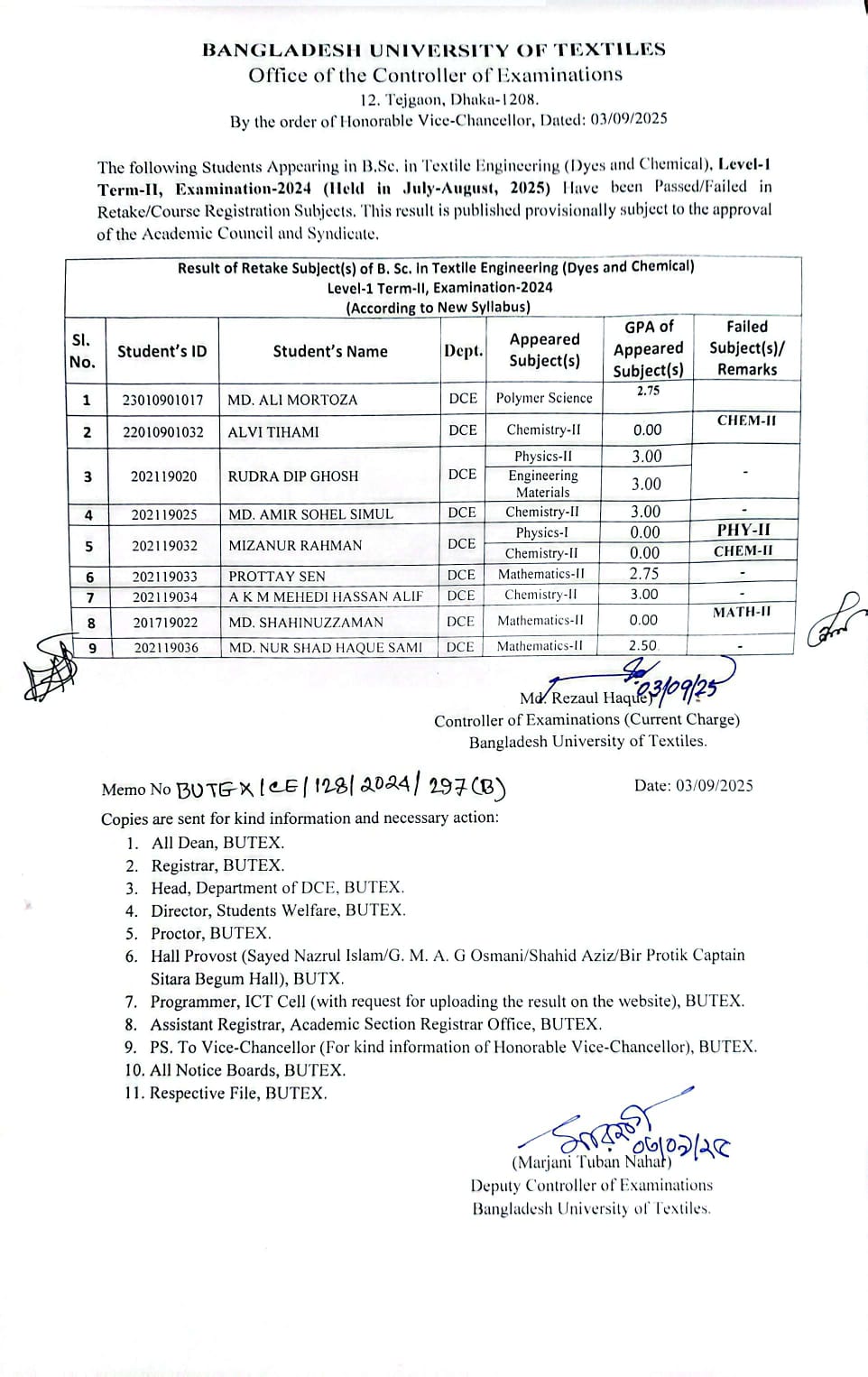 03 Sep 2025 Result of BSc in Textile Engineering (Dyes and Chemical) L1-T2 Published Results, Undergrade Admission News