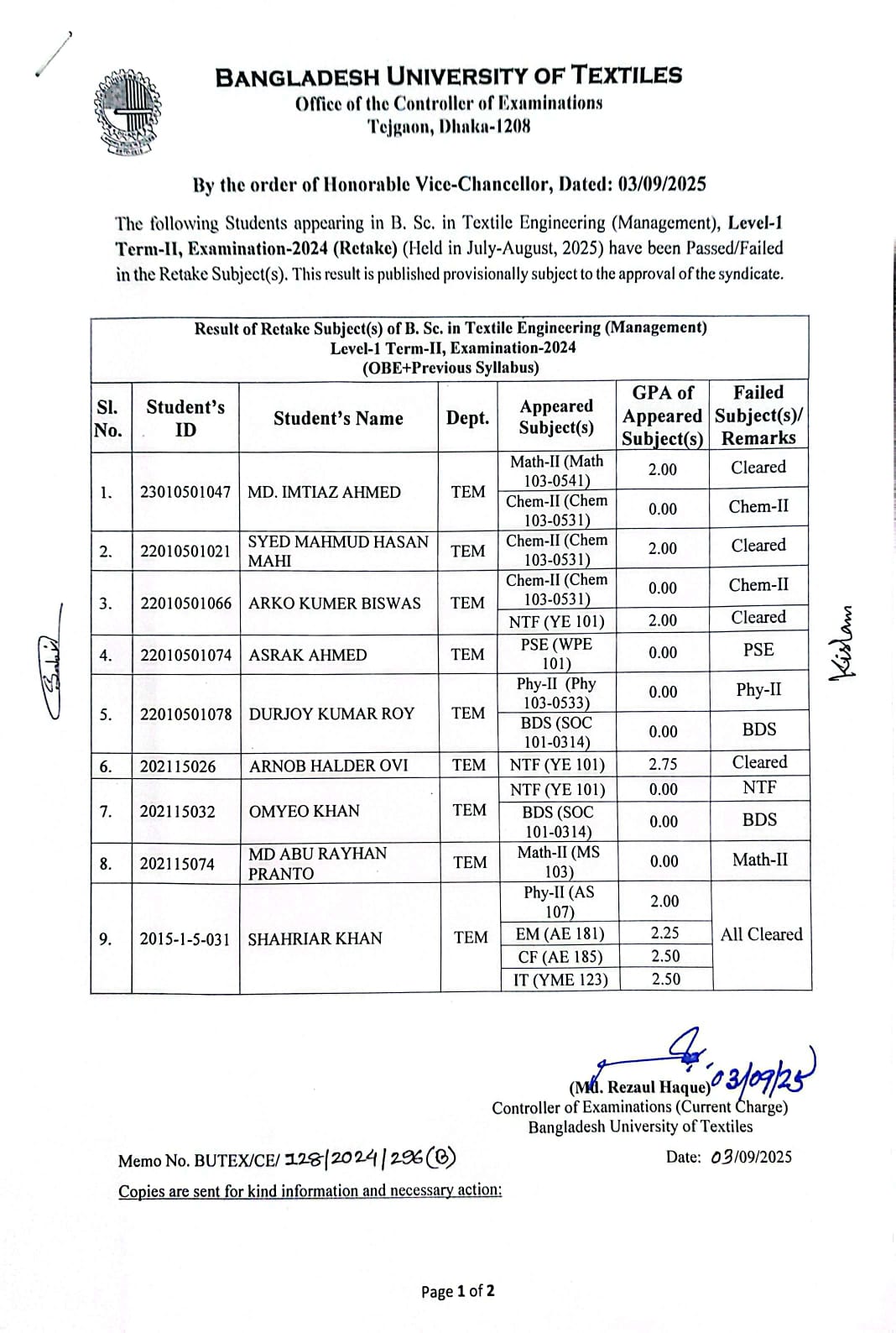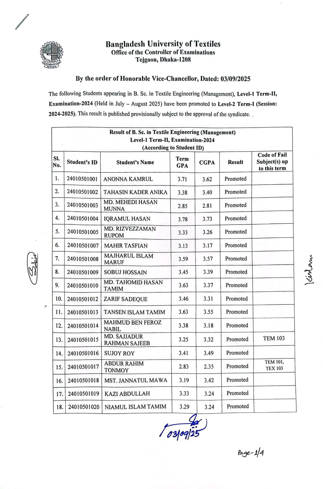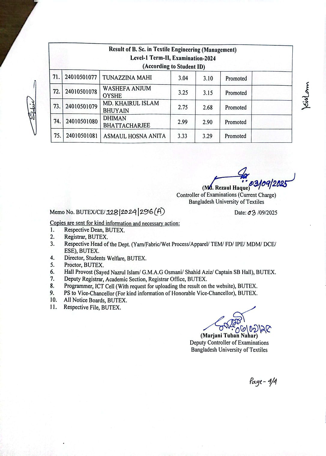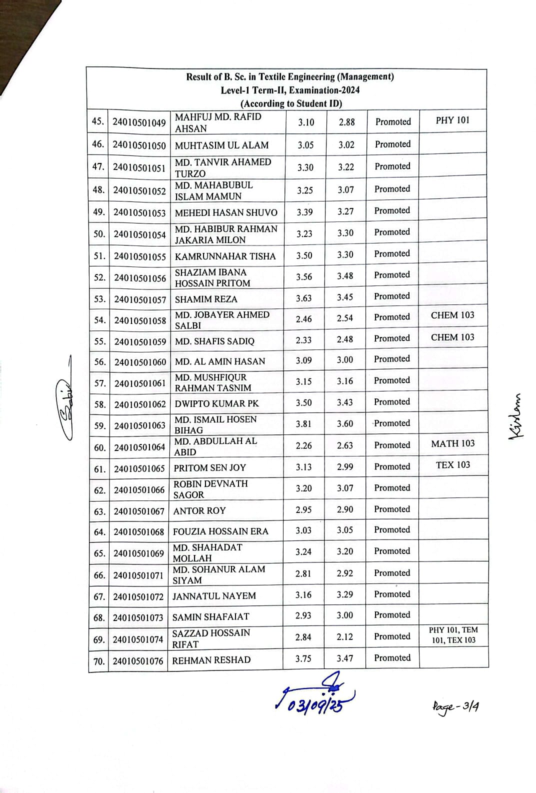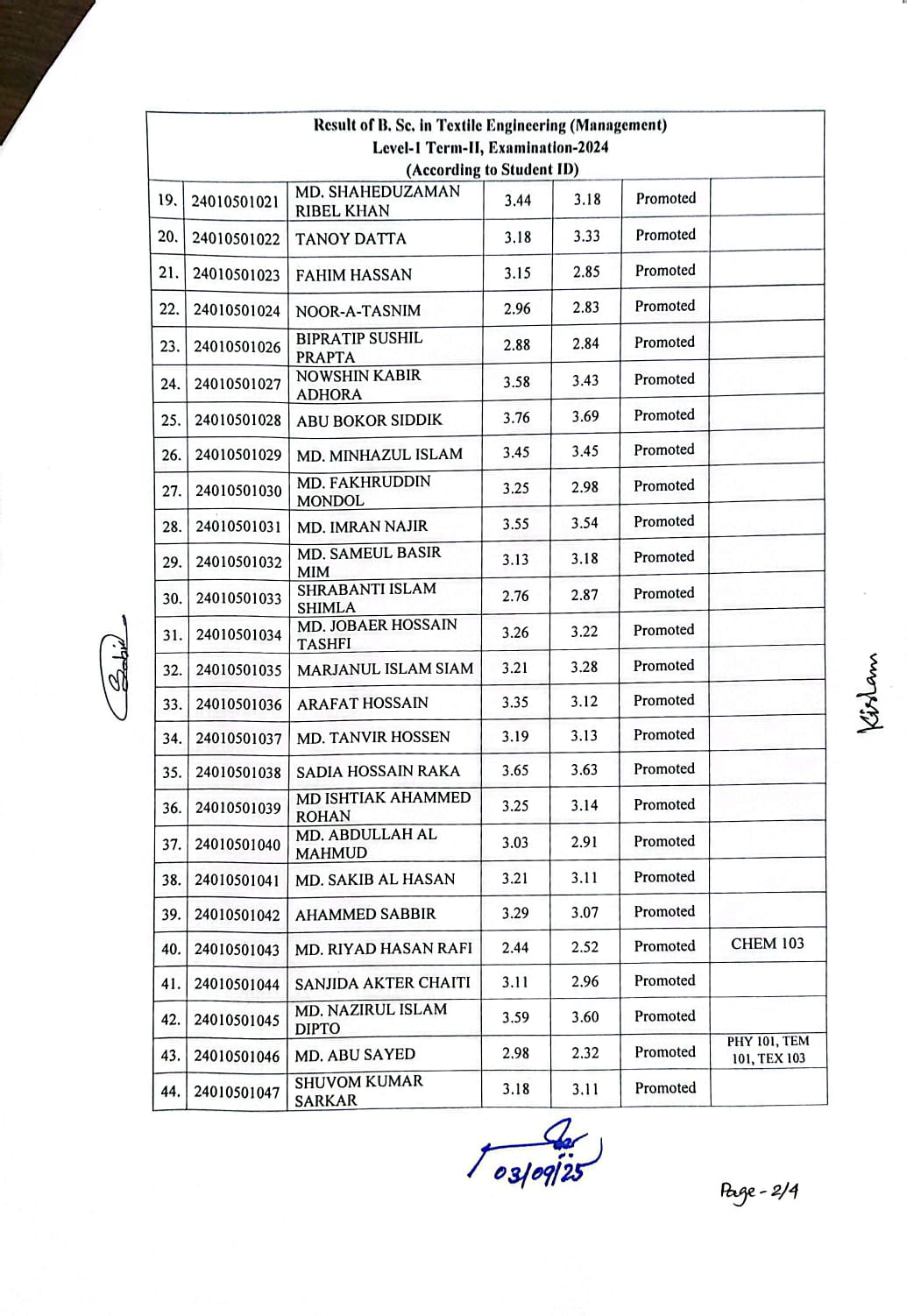 03 Sep 2025 Result of BSc in Textile Engineering (Management) L1-T2 Published Results, Undergrade Admission News