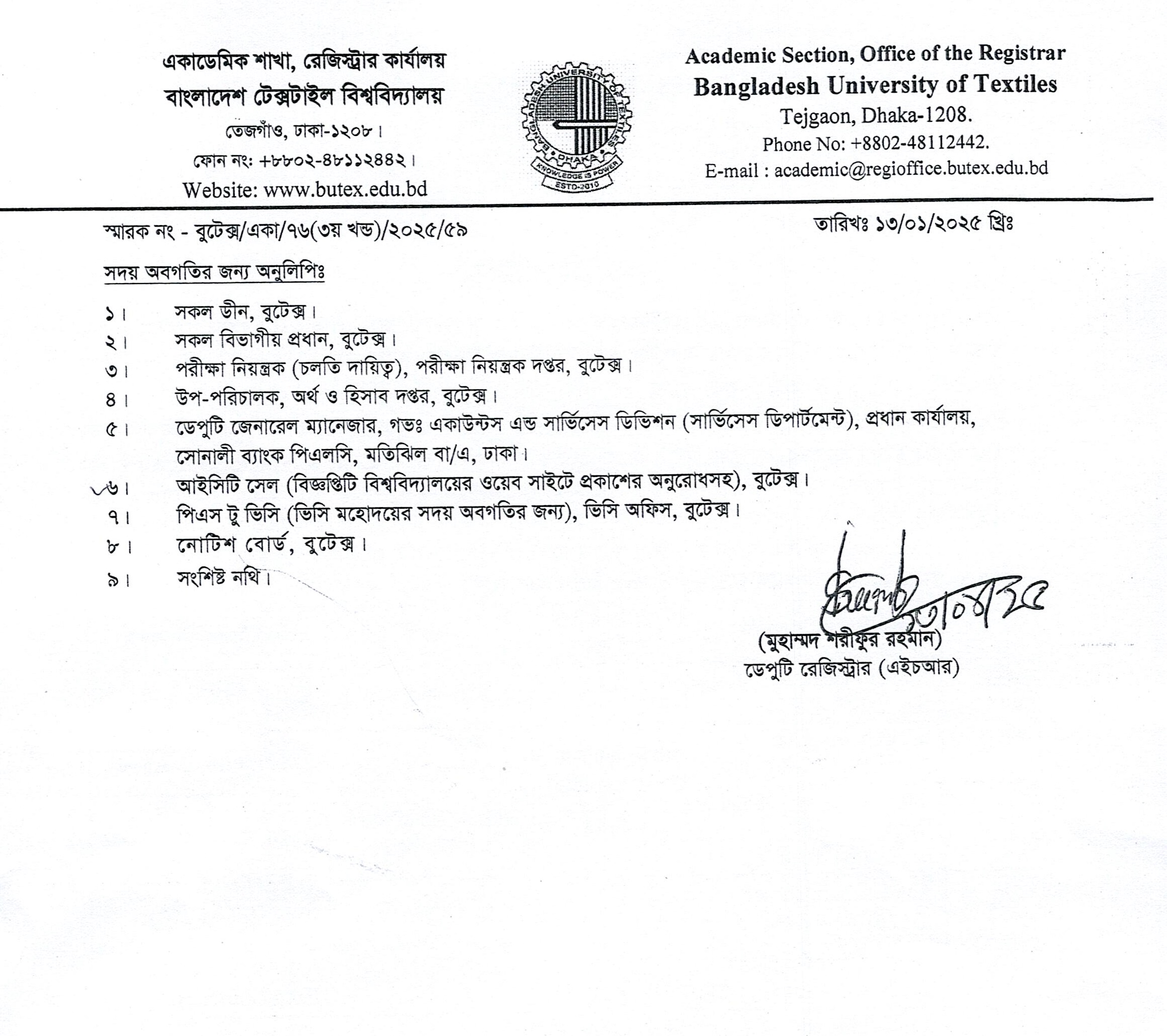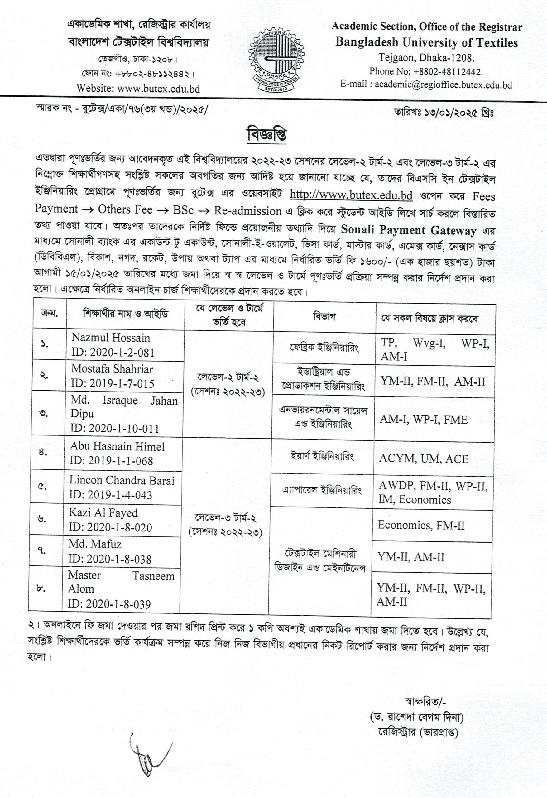 13 Jan 2025 Re-Admission Notice: B.Sc. in Textile Engineering L-2 T-2, L-3 T-2 Academic Notices, Undergrade Admission News Desk