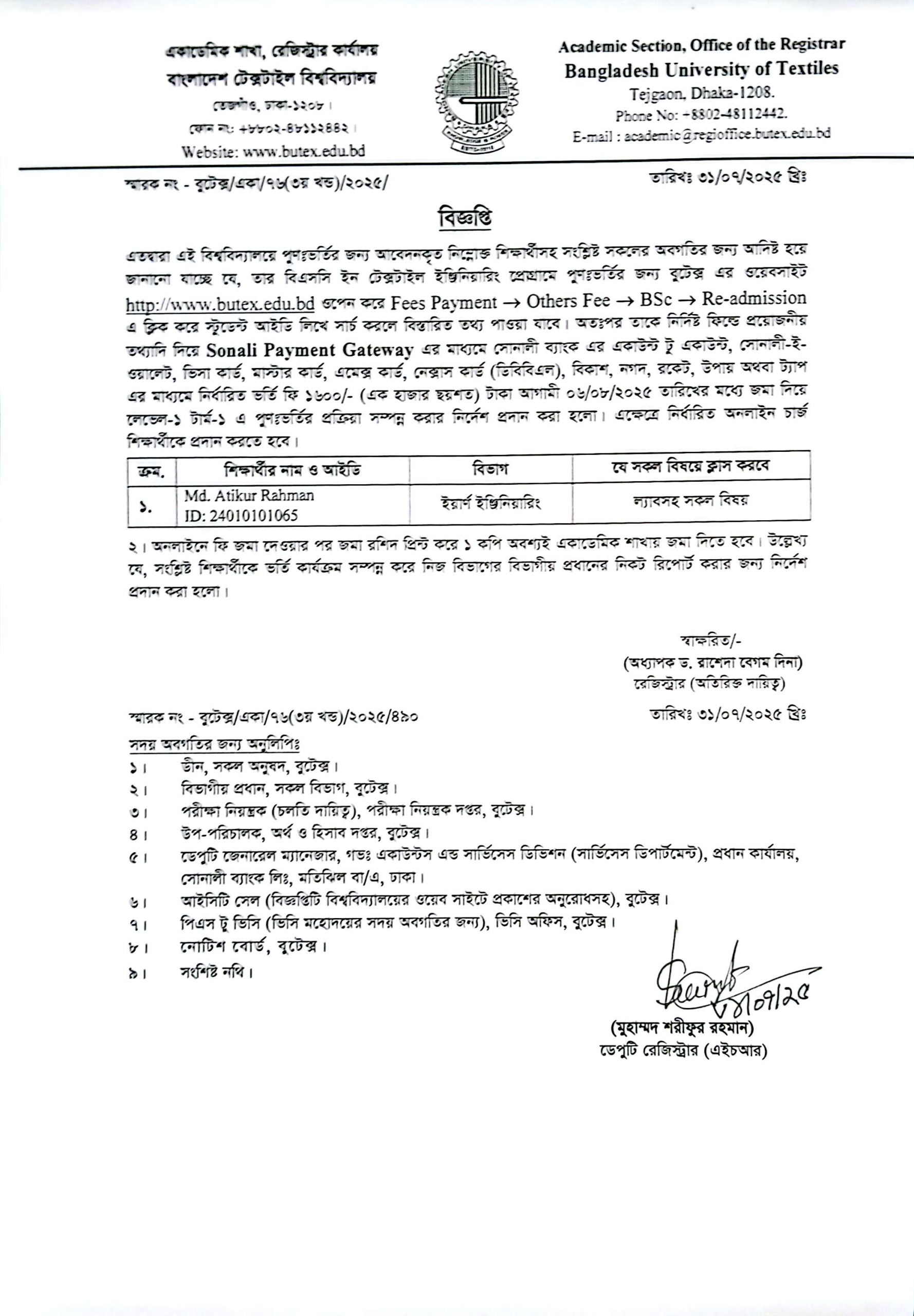 04 Aug 2025 Re-Admission Notice: BSc in Textile Engineering L1-T1 (YE Dept.) Academic Notices, Undergrade Admission News