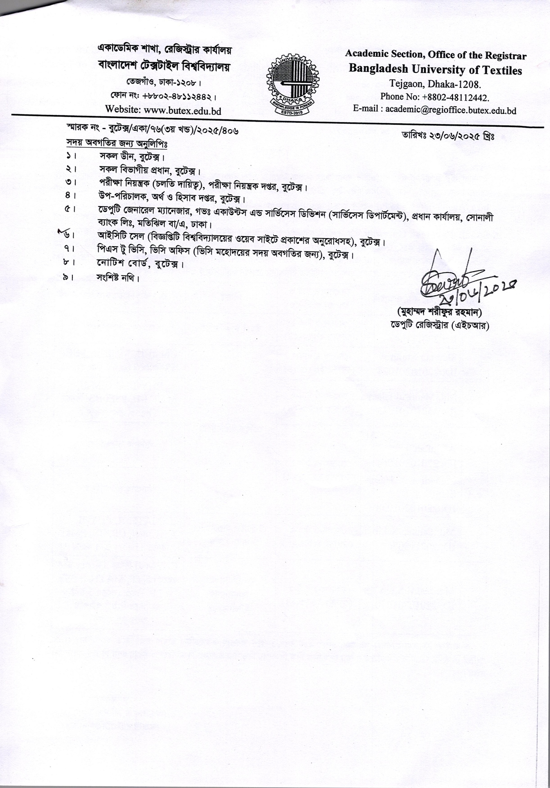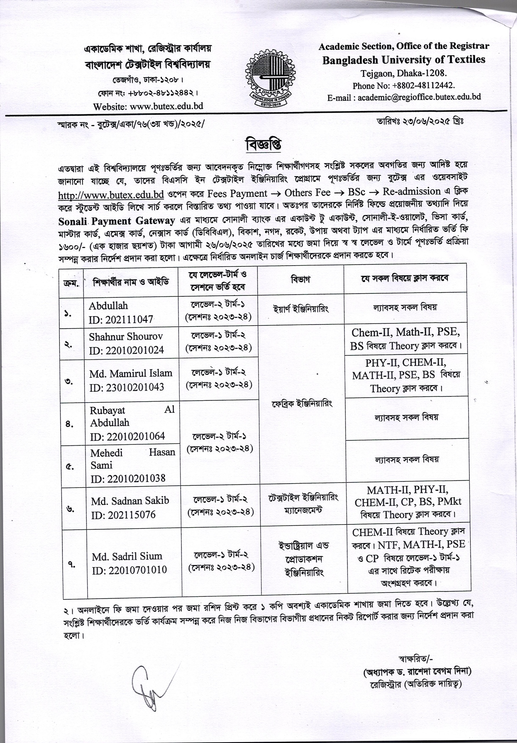 24 Jun 2025 Re-Admission Notice: BSc in Textile Engineering Program Academic Notices, Undergrade Admission News