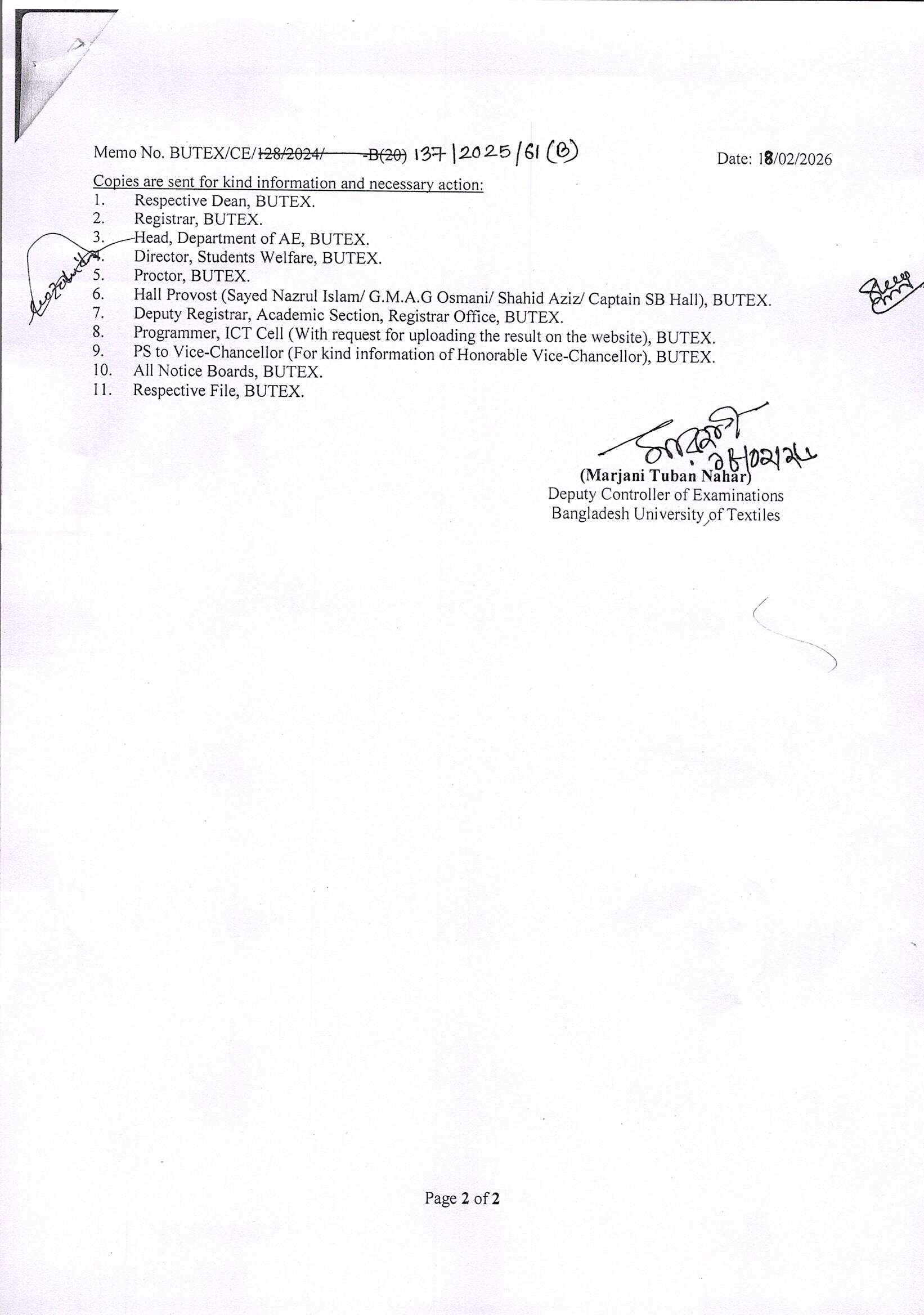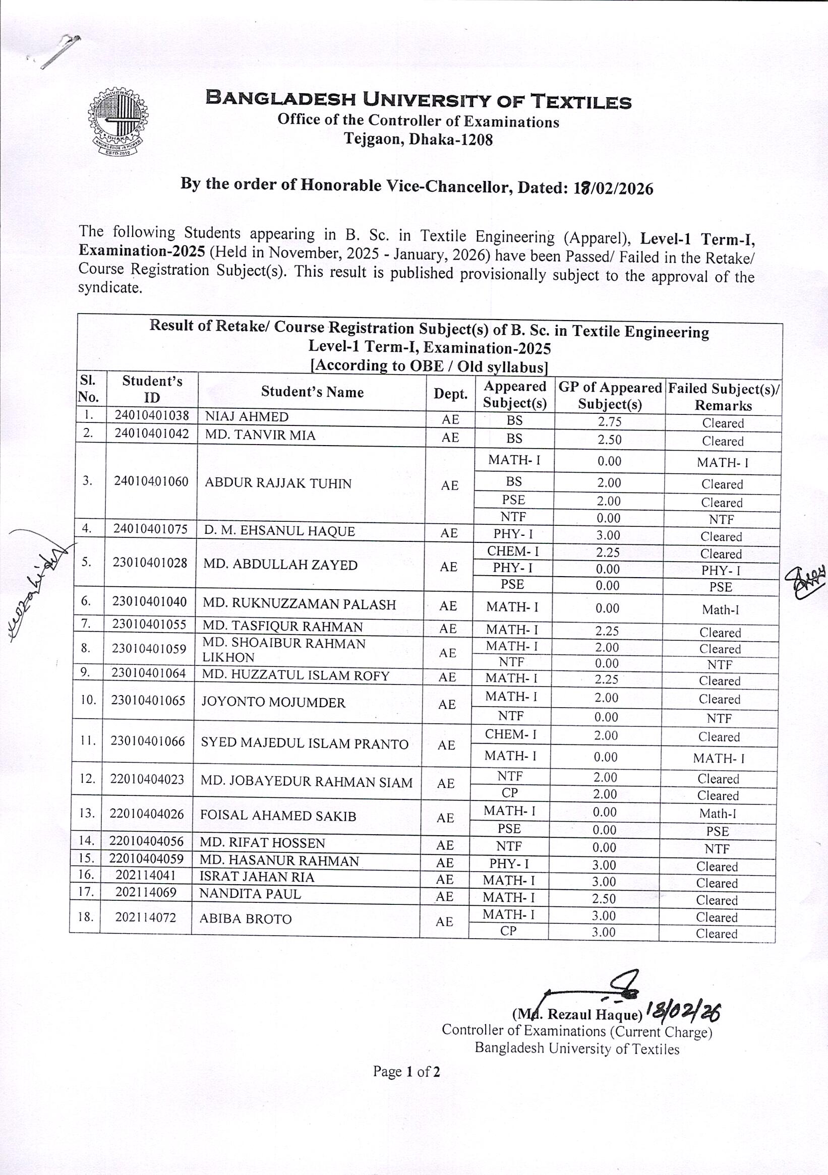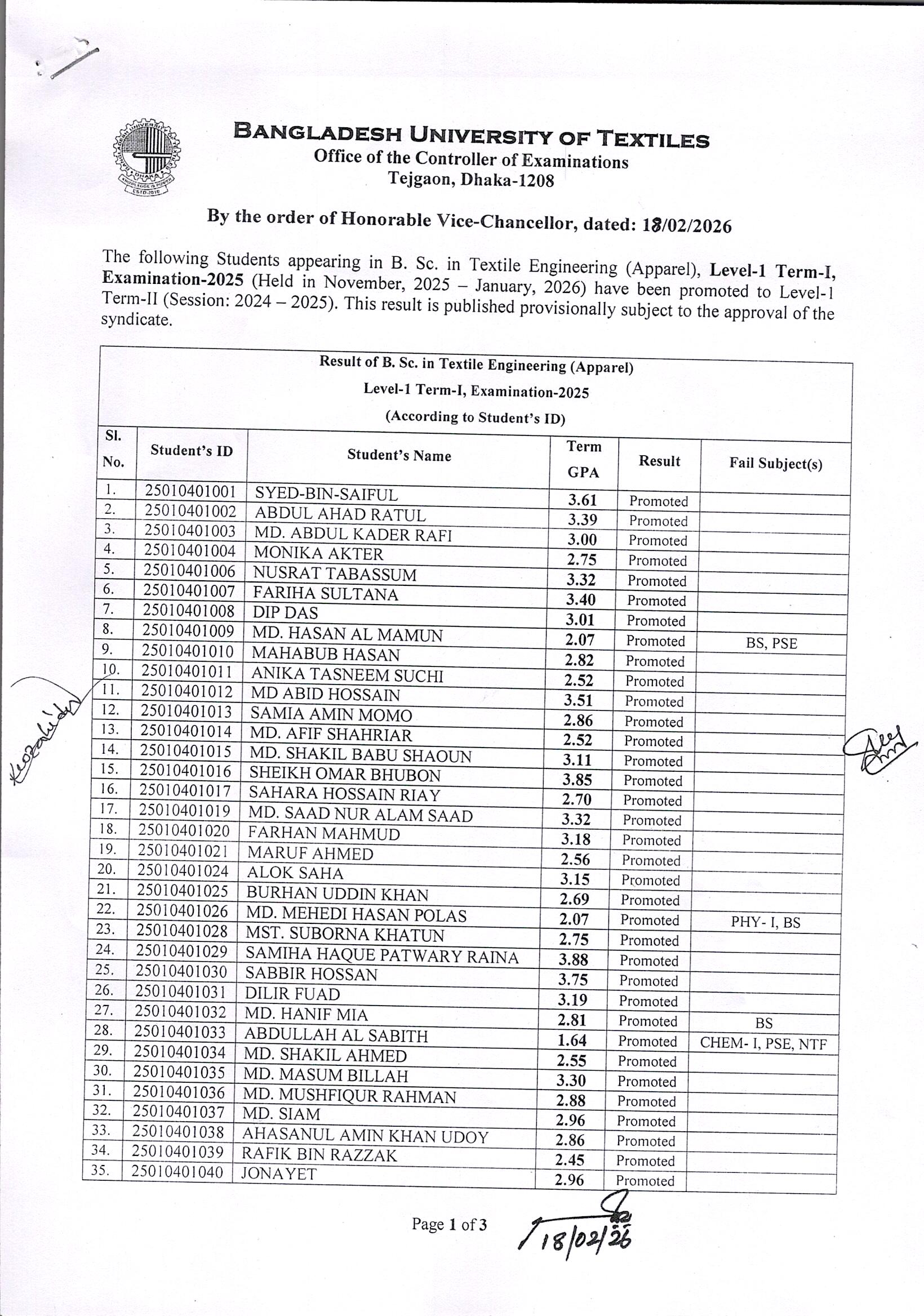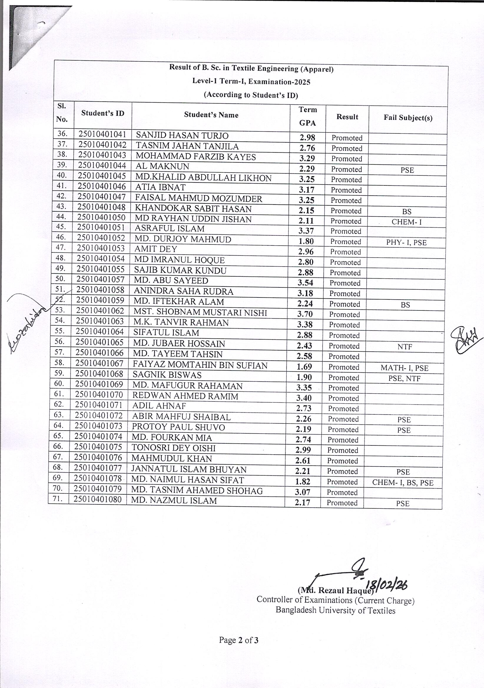 Result of BSc in Textile Engineering (Apparel) L1-T1