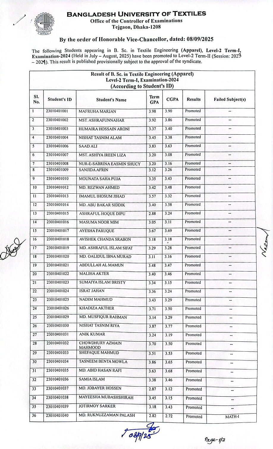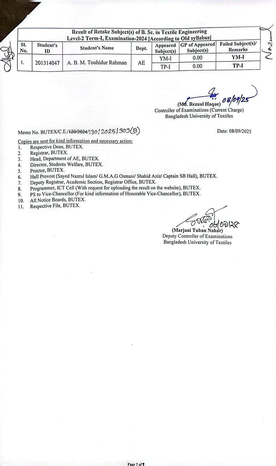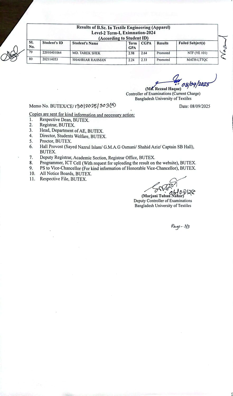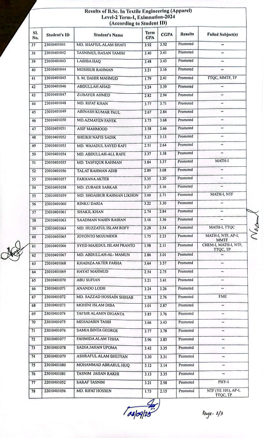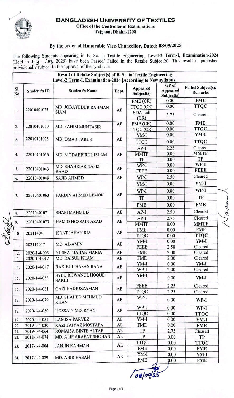 Result of BSc in Textile Engineering (Apparel) L2-T1