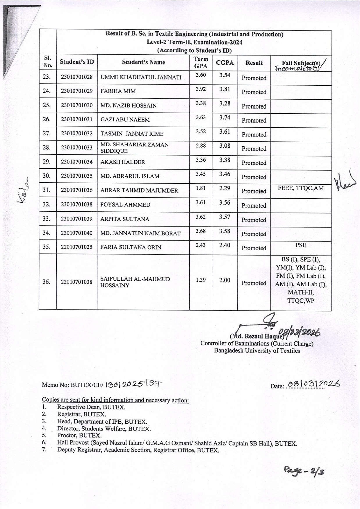 Result of BSc in Textile Engineering (Industrial and Production) L2-T2
