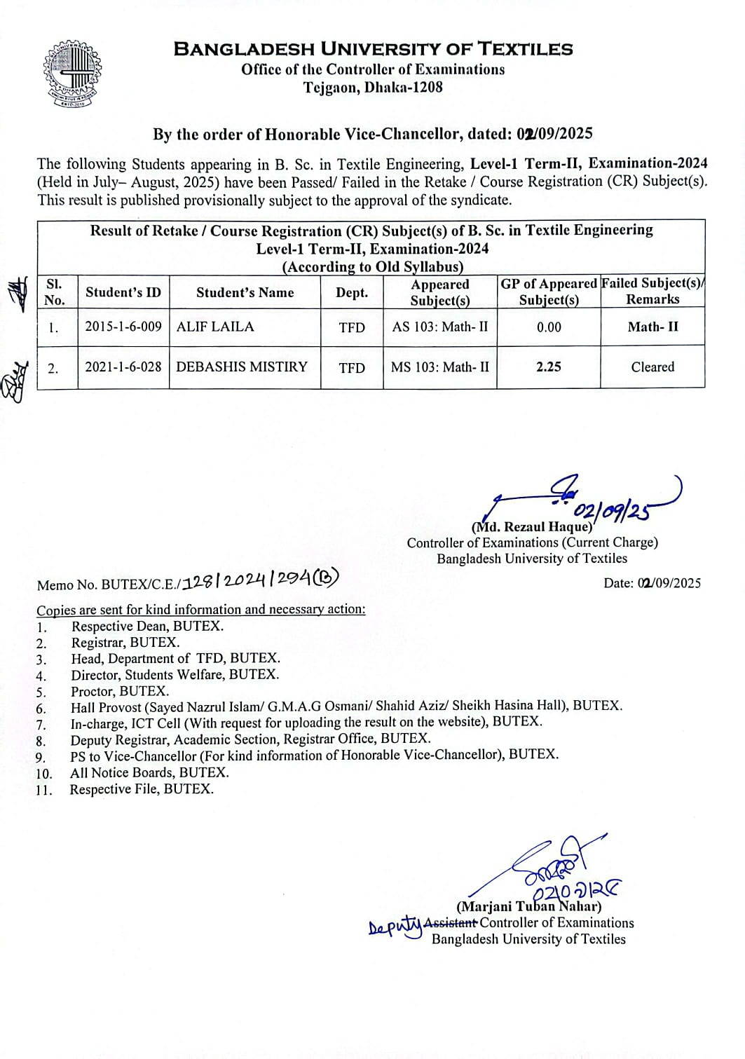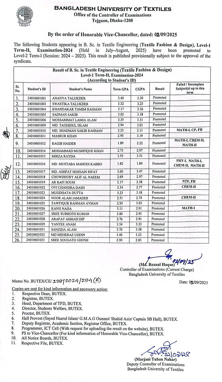 Result of BSc in Textile Engineering (TFD) L1-T2
