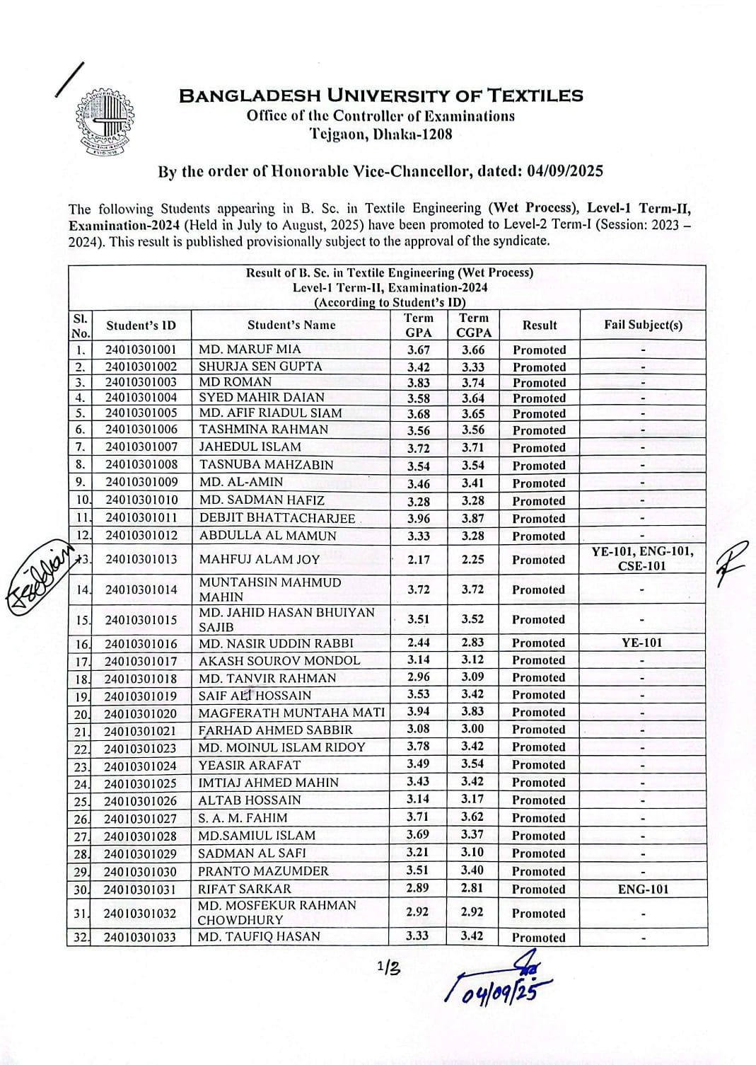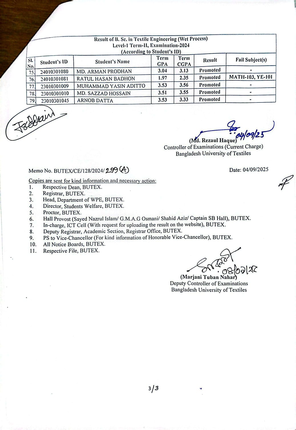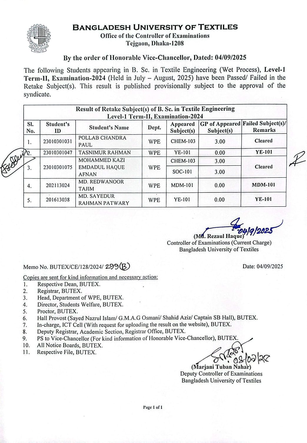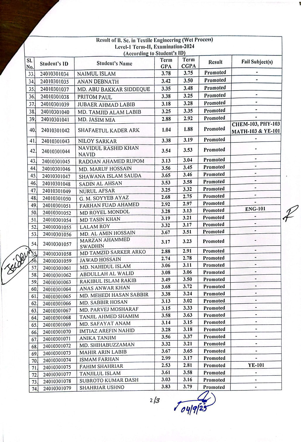 Result of BSc in Textile Engineering (Wet Process) L1-T2