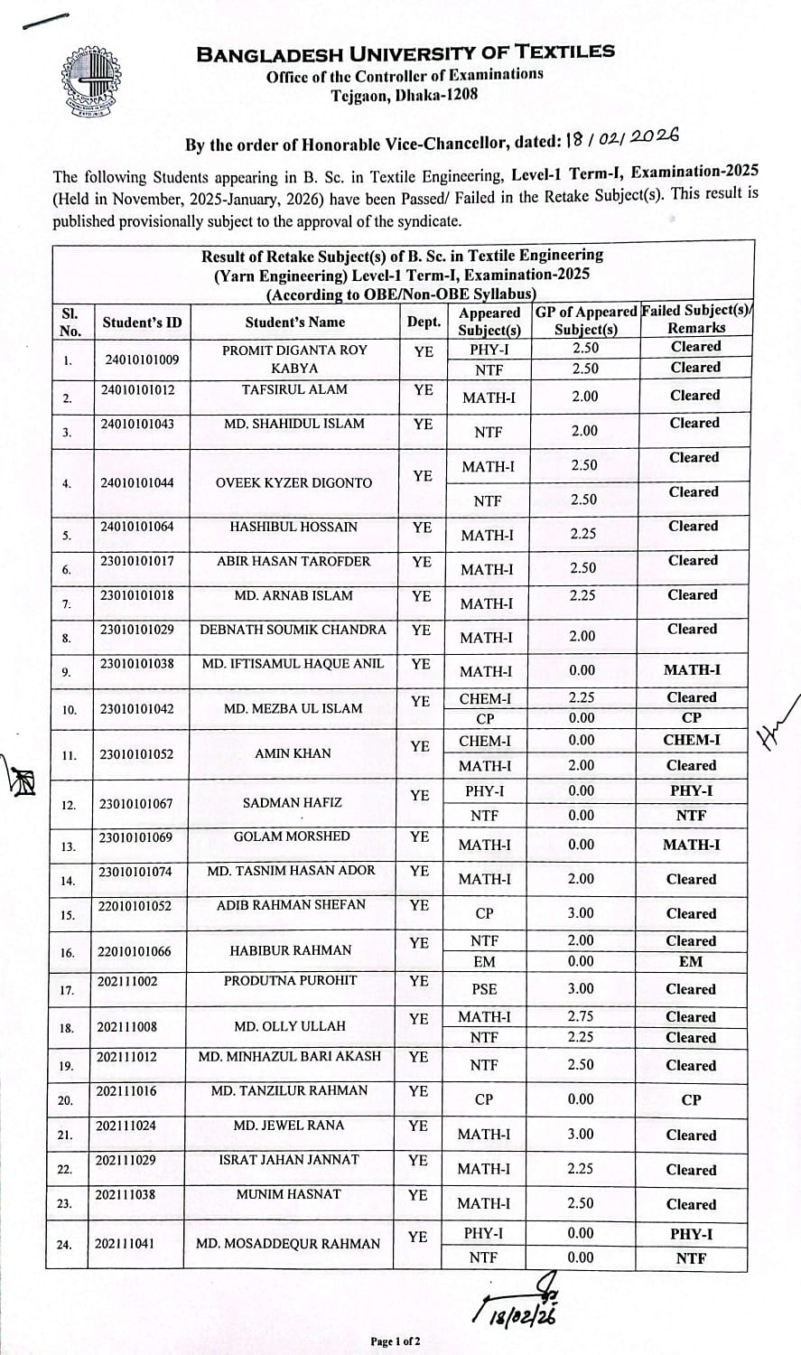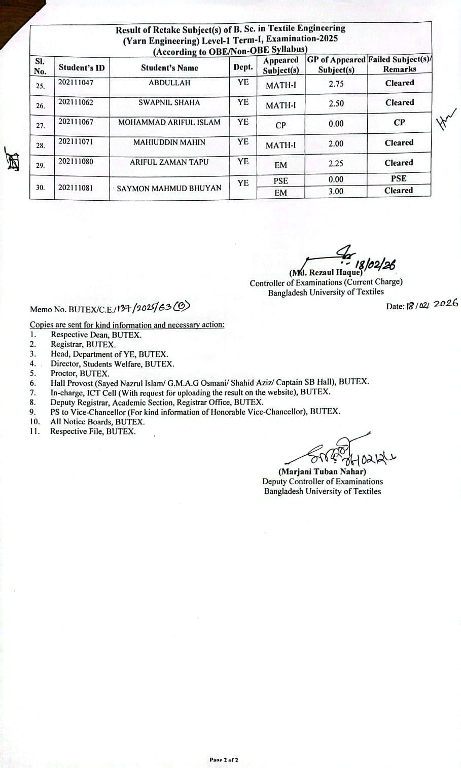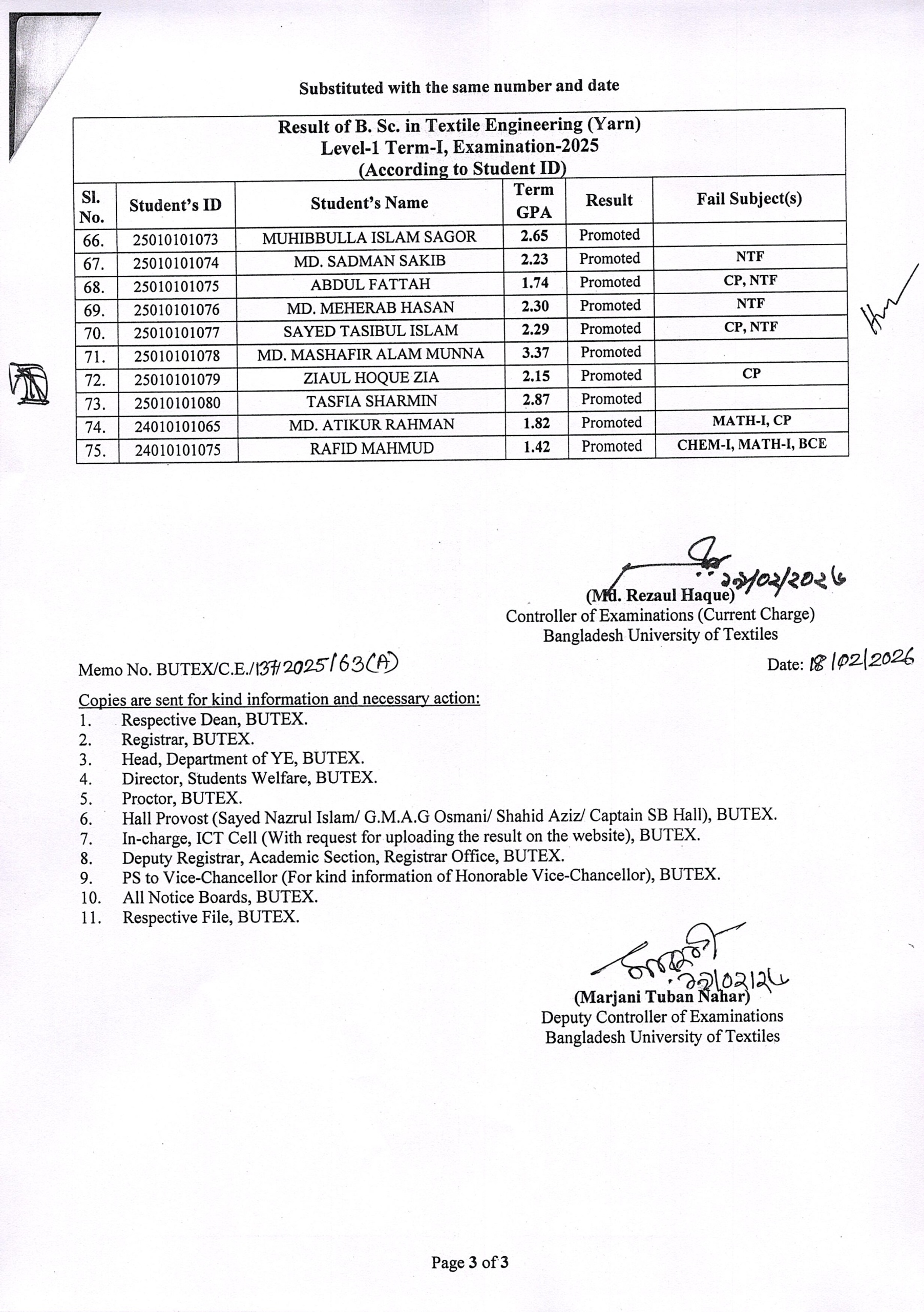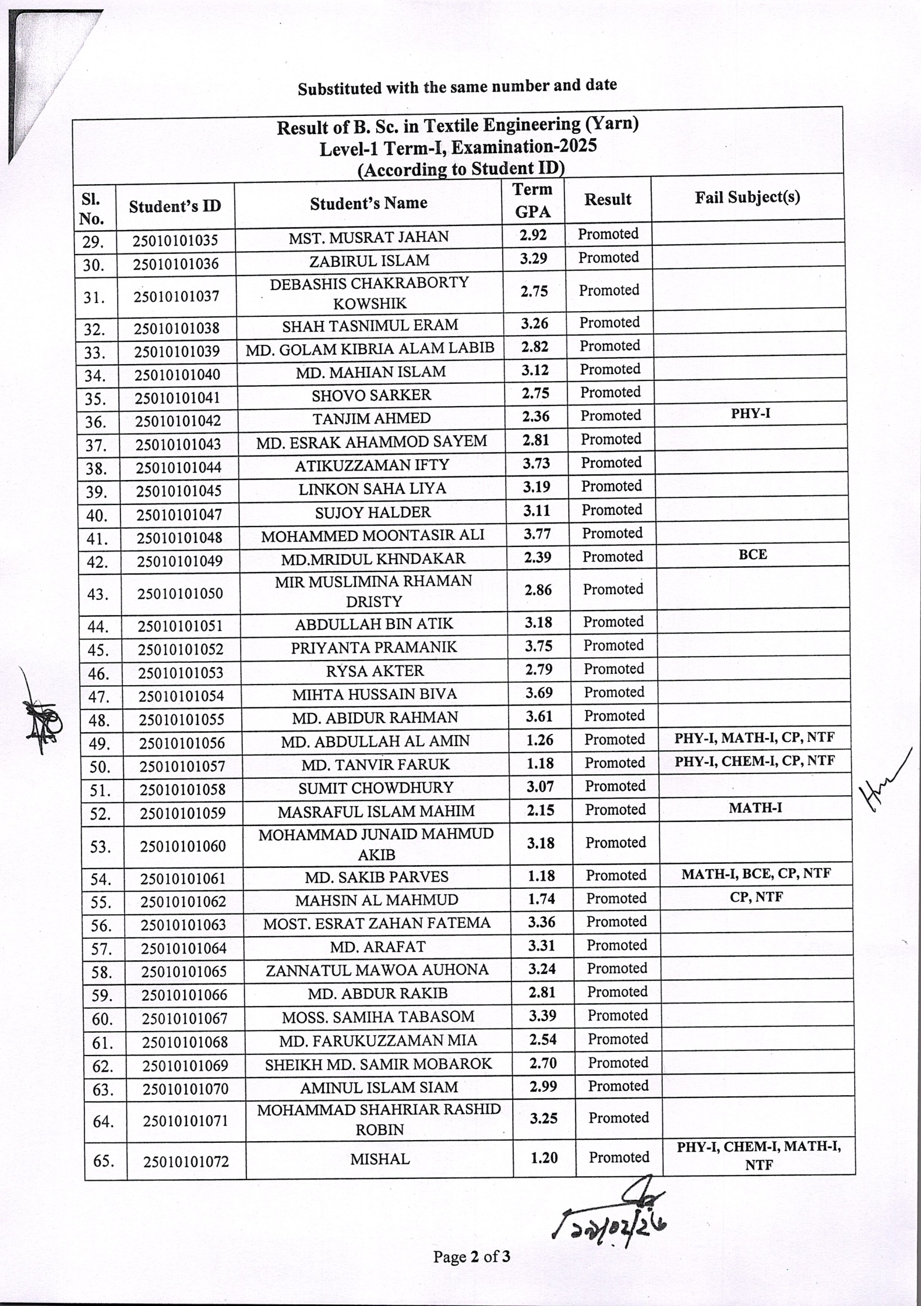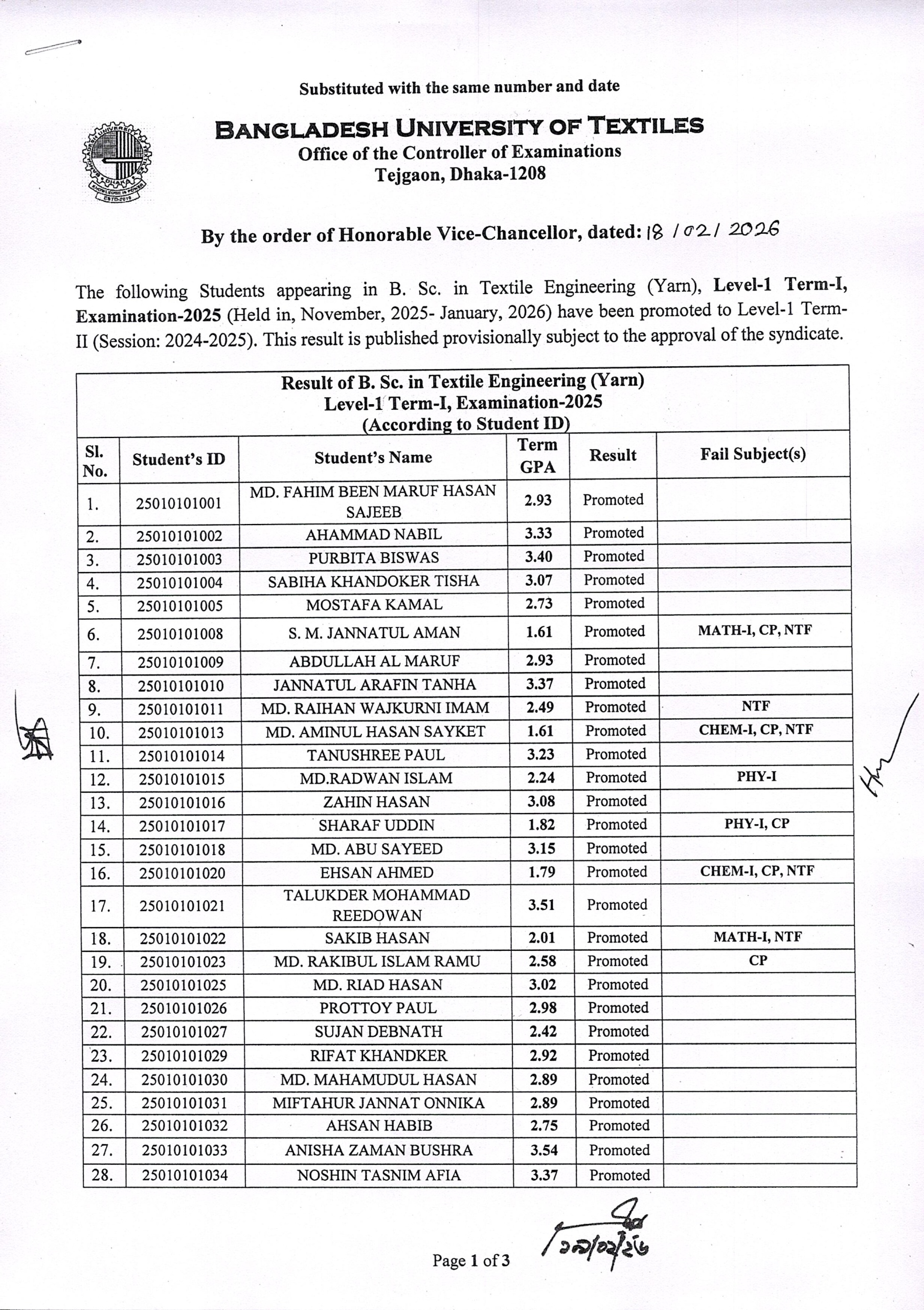 Result of BSc in Textile Engineering (Yarn) L1-T1