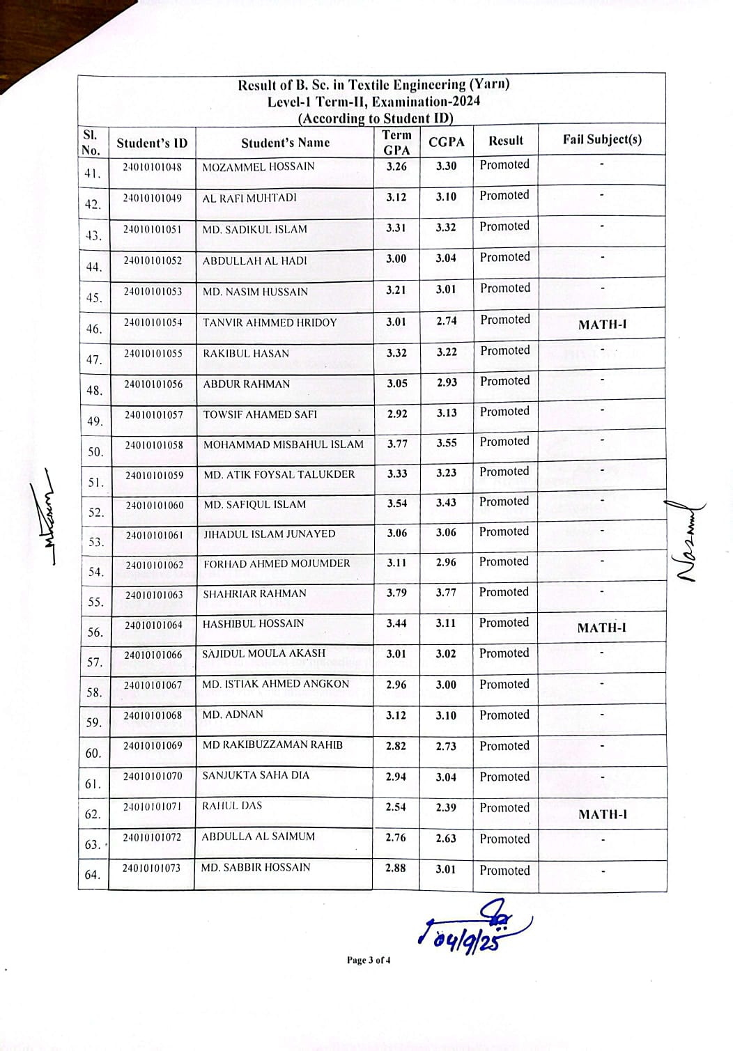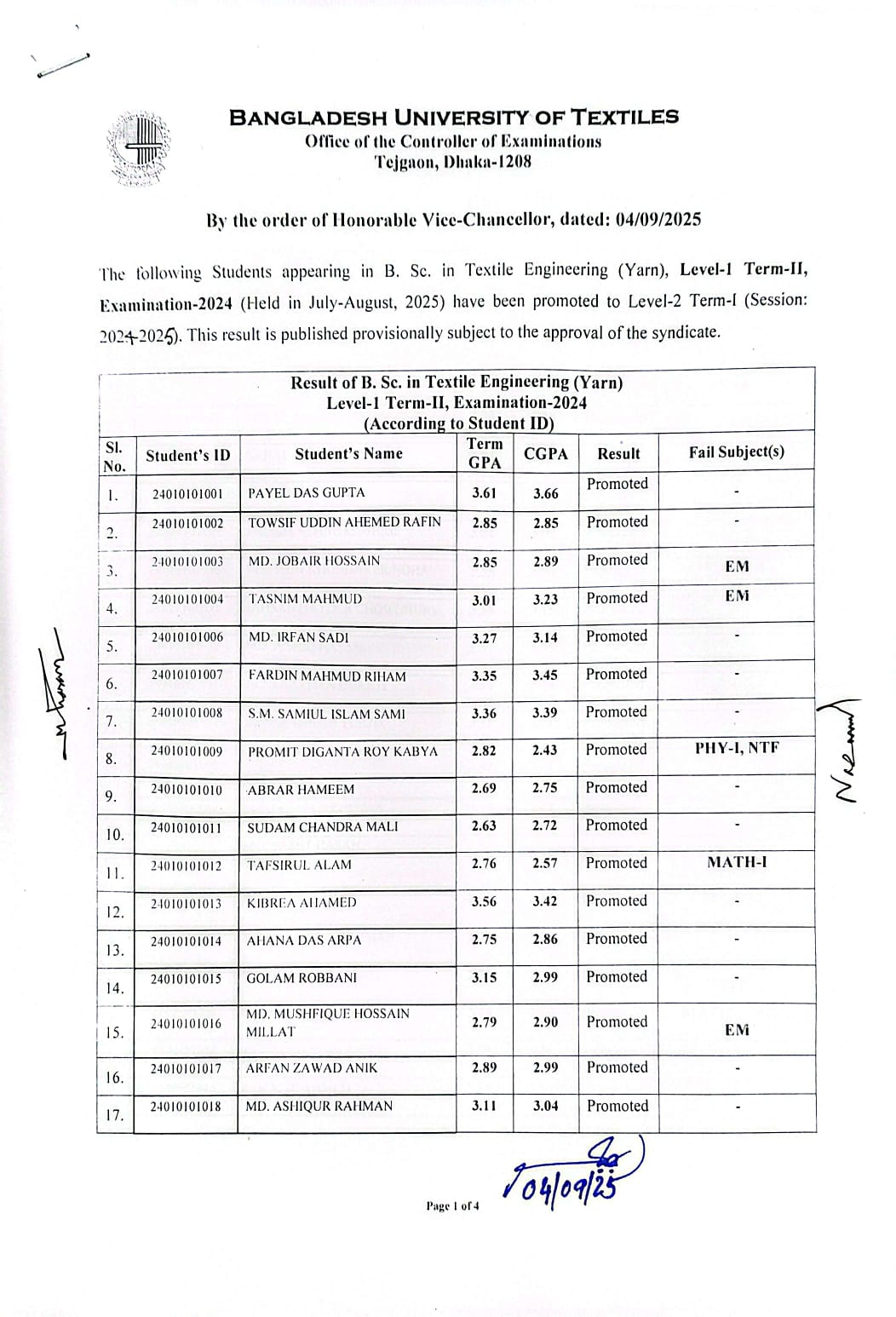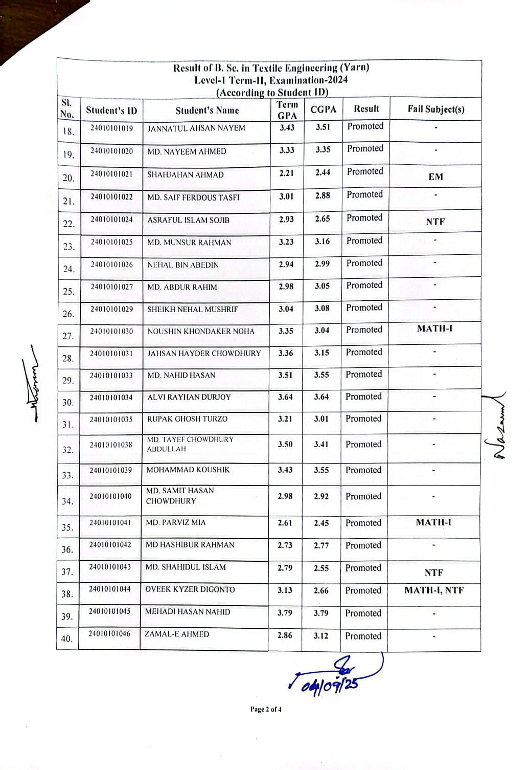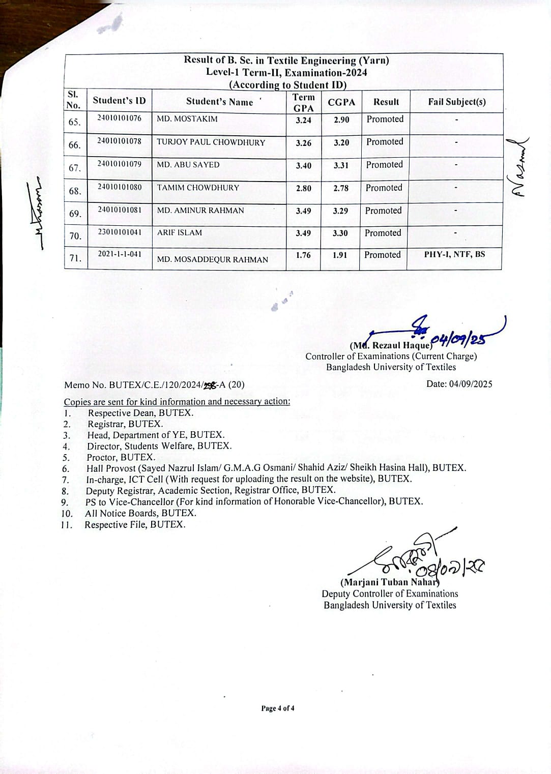 Result of BSc in Textile Engineering (Yarn) L1-T2