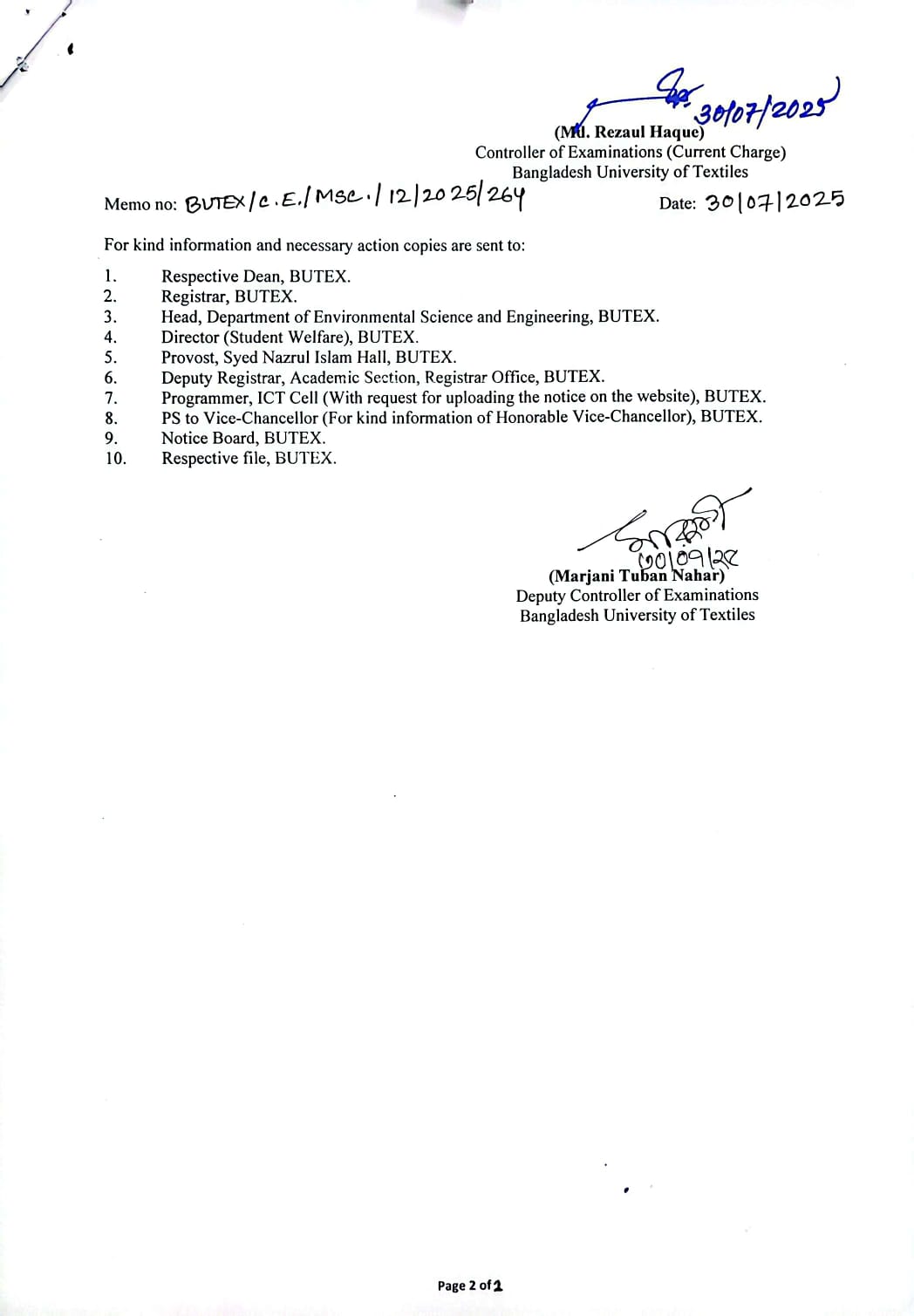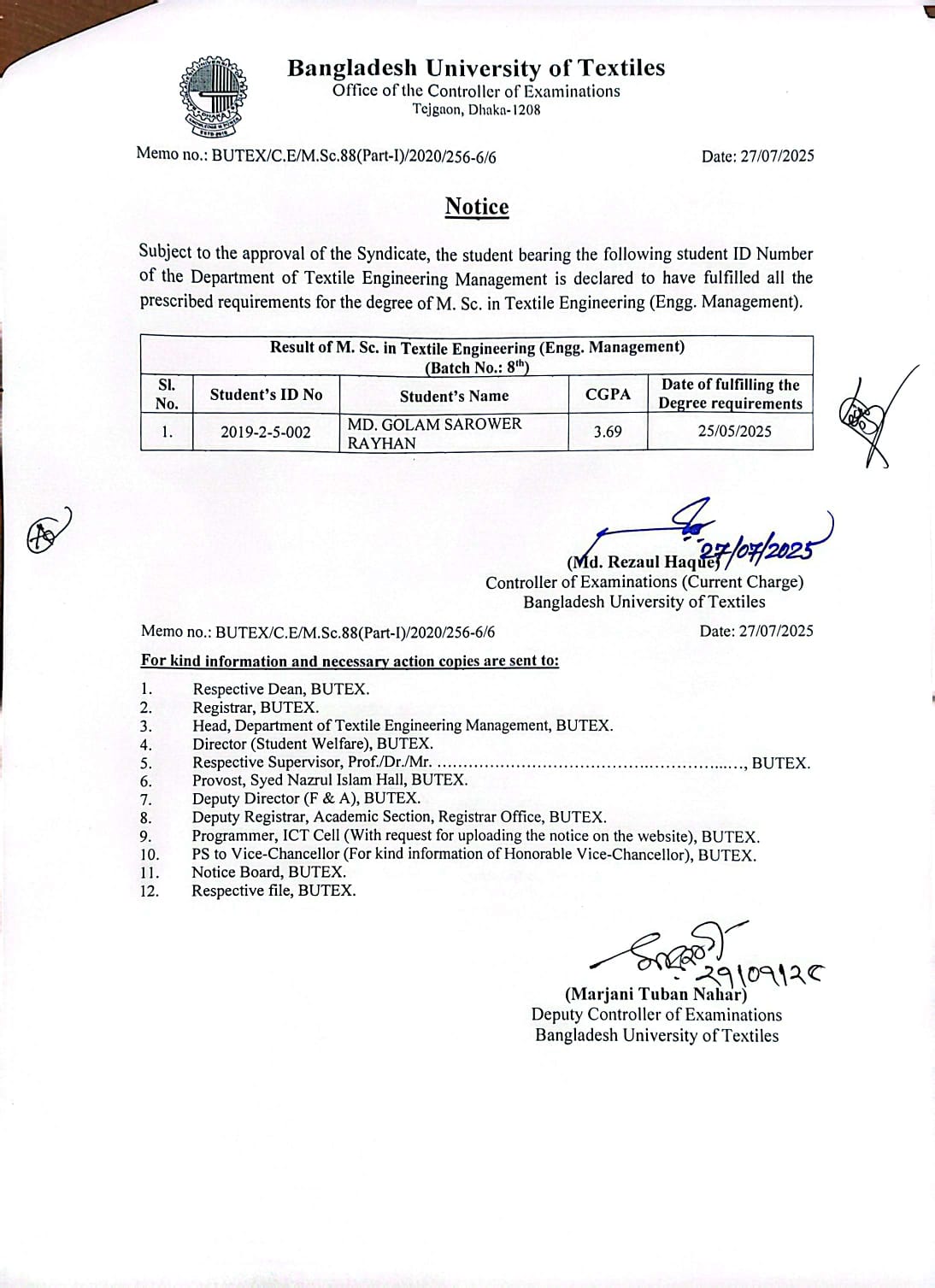 31 Jul 2025 Result of MSc in Sustainability in Textiles (ESE) 1st Batch 1st Semester Postgraduate Admission, Published Results News