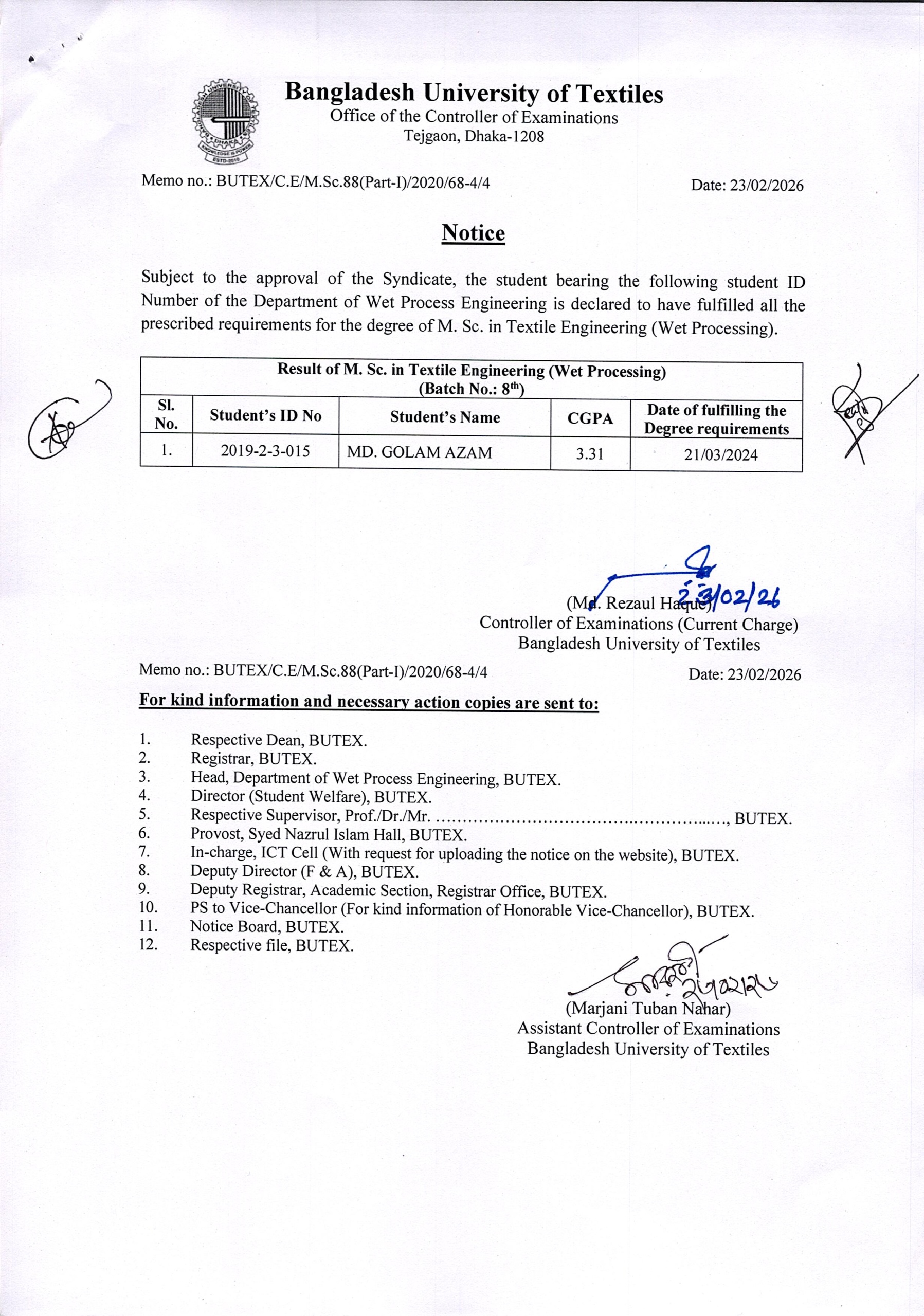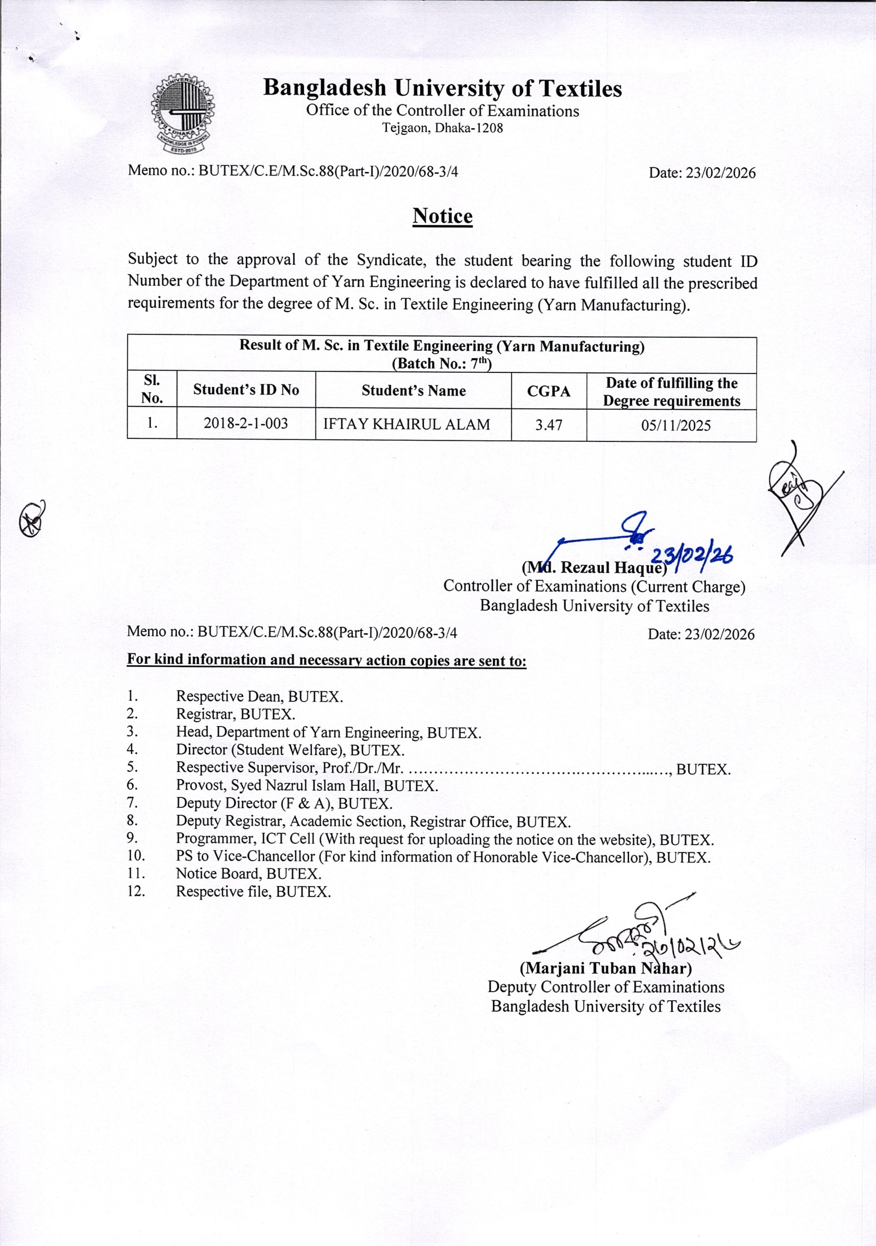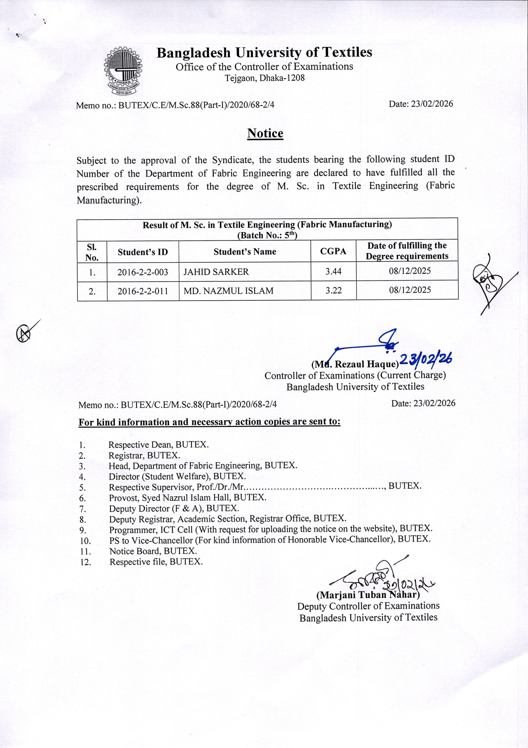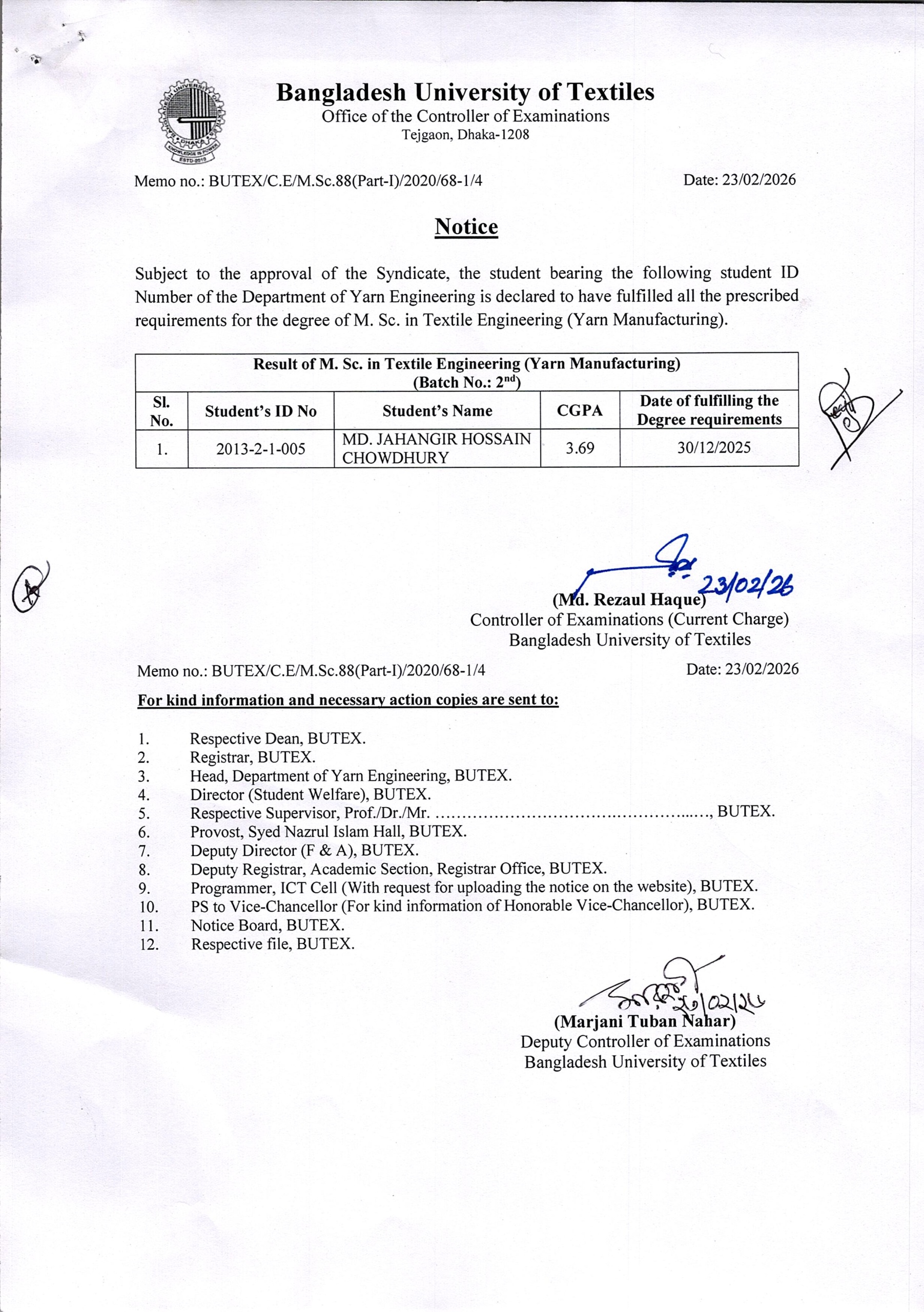 23 Feb 2026 Result of MSc in Textile Engineering Dated: 23/02/2026 Postgraduate Admission, Published Results News