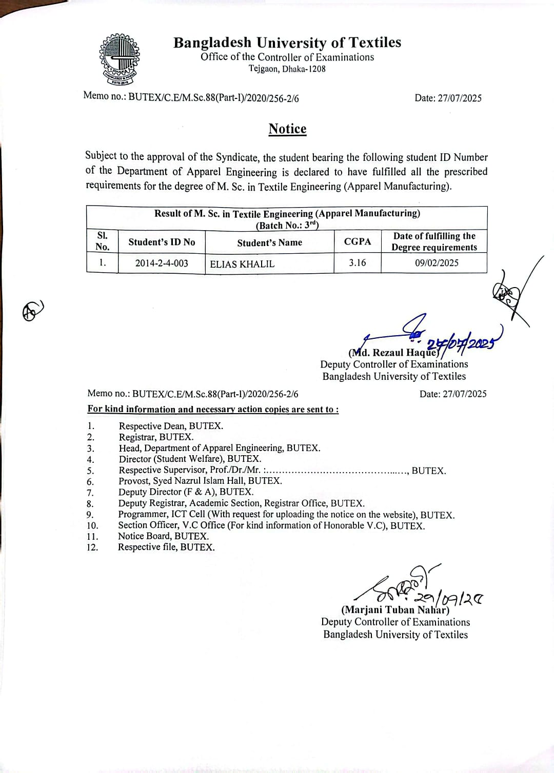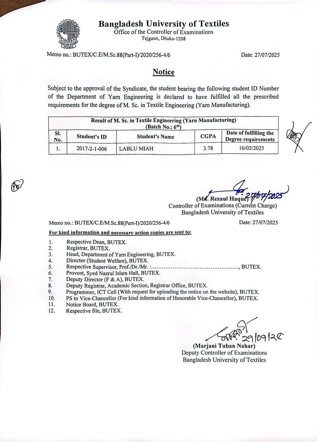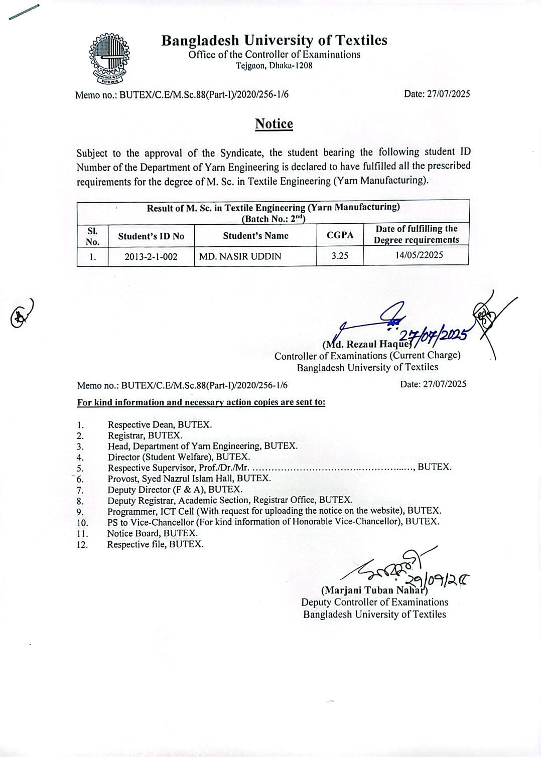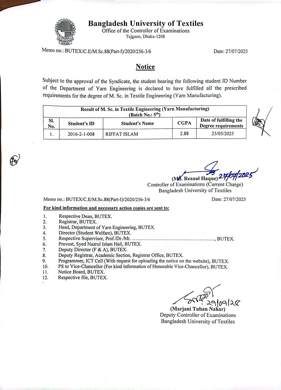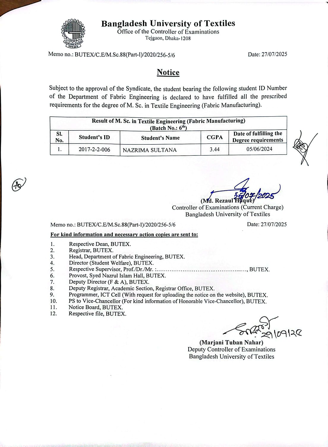 27 Jul 2025 Result of MSc in Textile Engineering Dated 27-07-2025 Postgraduate Admission, Published Results News Desk