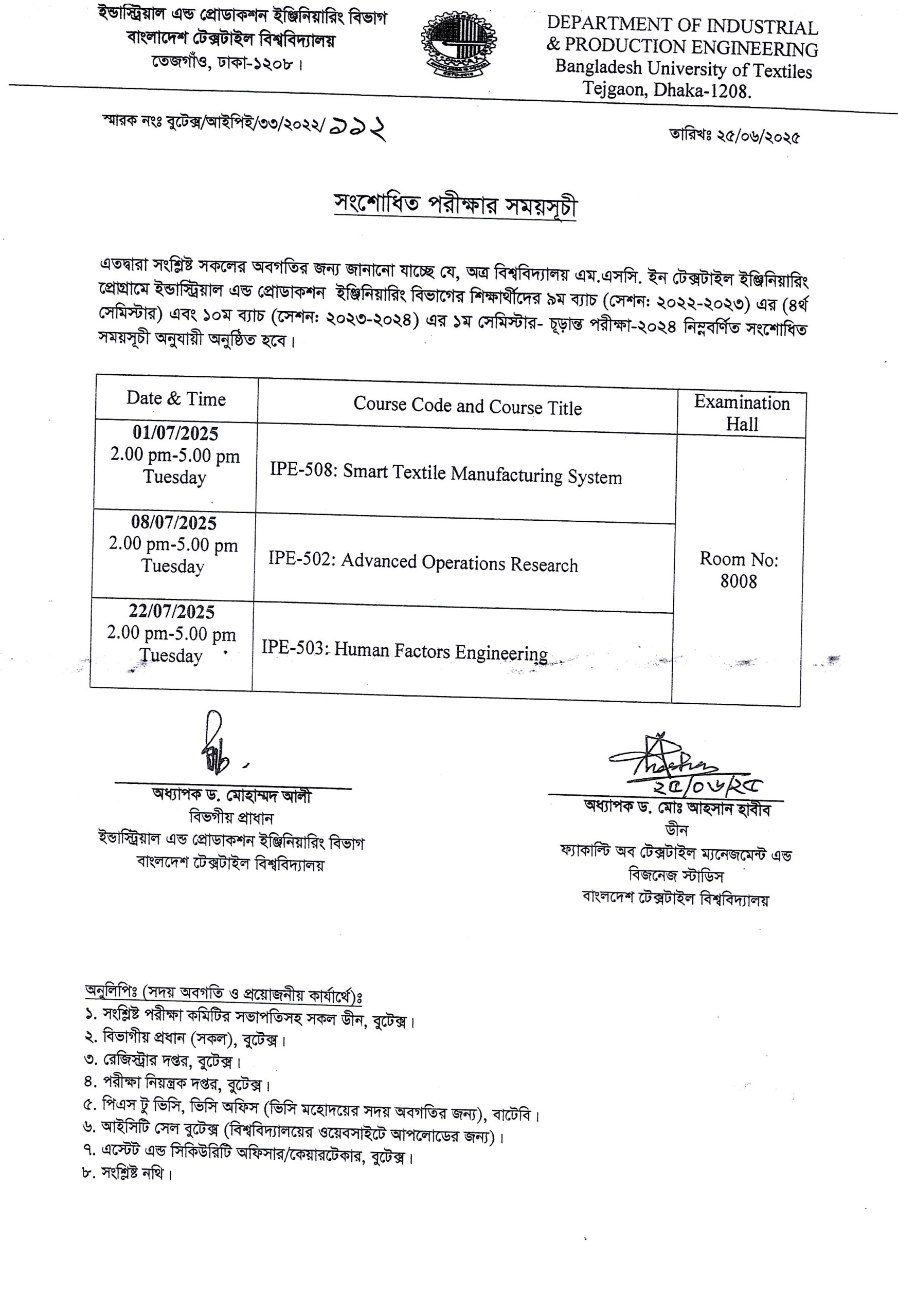 Revised Exam Schedule of MSc in Textile Engineering (IPE Dept.) 9th & 10th Batch