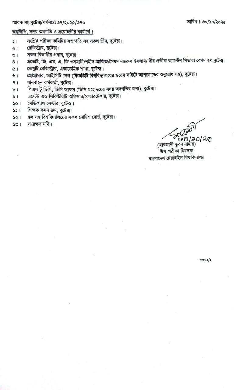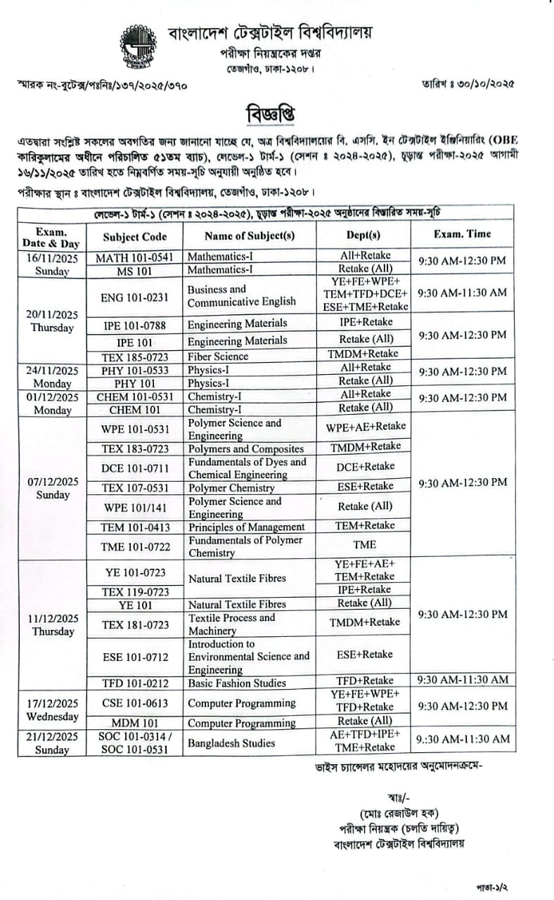 30 Oct 2025 Schedule of BSc in Textile Engineering L1-T1 Exam-2025 Academic Notices, Undergrade Admission News