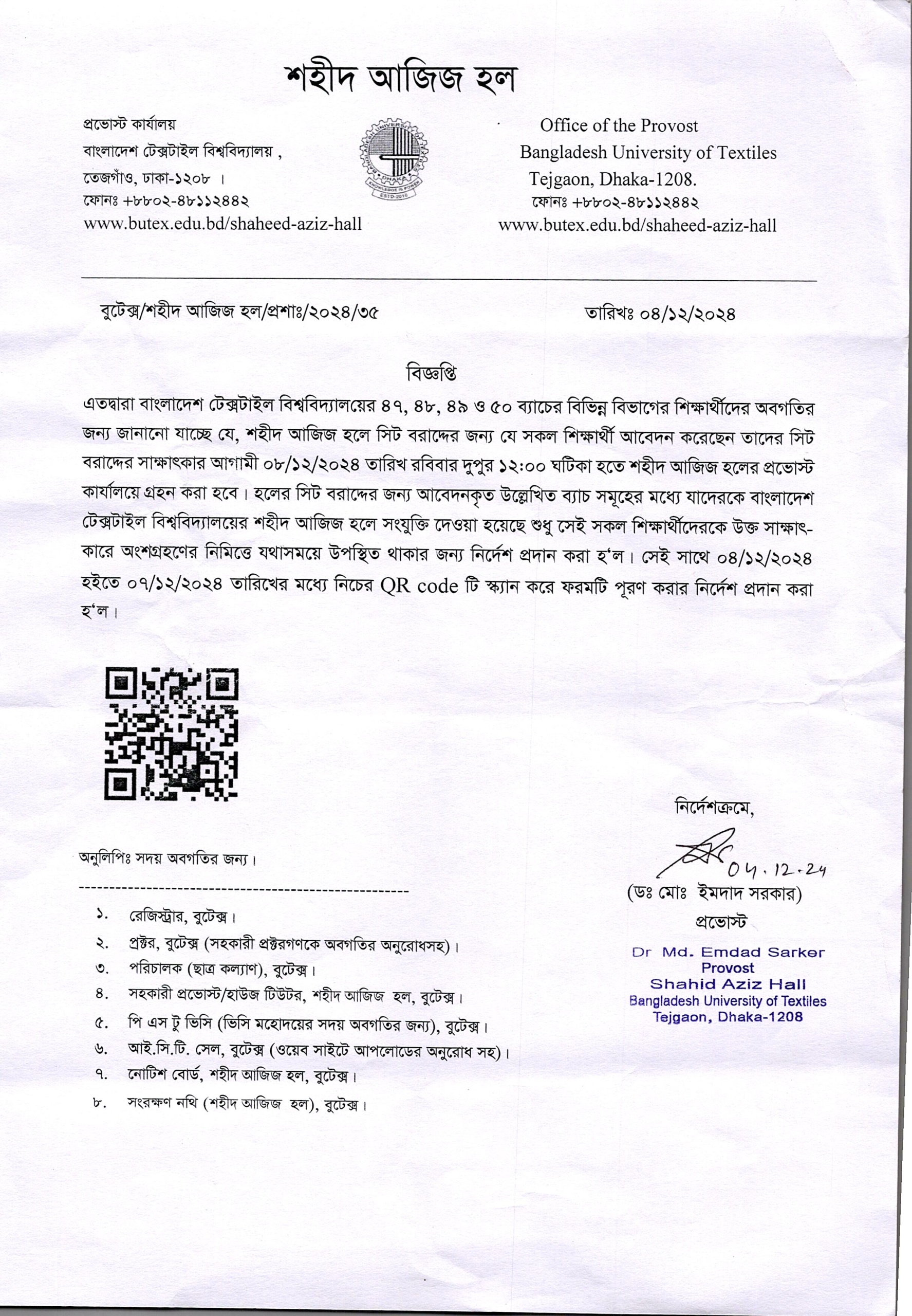 04 Dec 2024 Seat Allotment Viva of Shahid Aziz Hall Will be Held on 08/12/2024 at 12 pm Administrative Notices News
