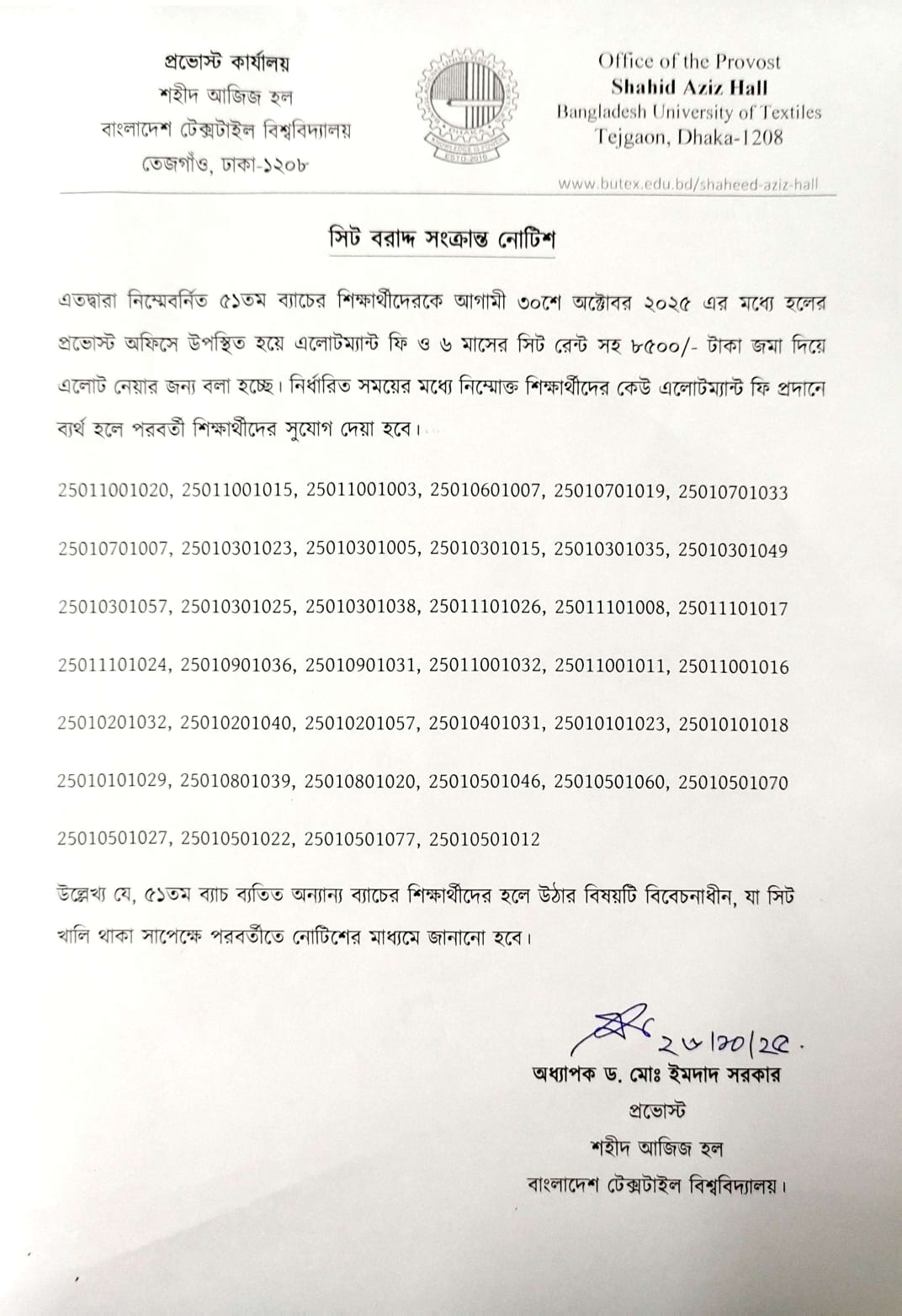 26 Oct 2025 Shahid Aziz Hall: Seat Allotment Fees Payment Notice of 51th Batch Administrative Notices News