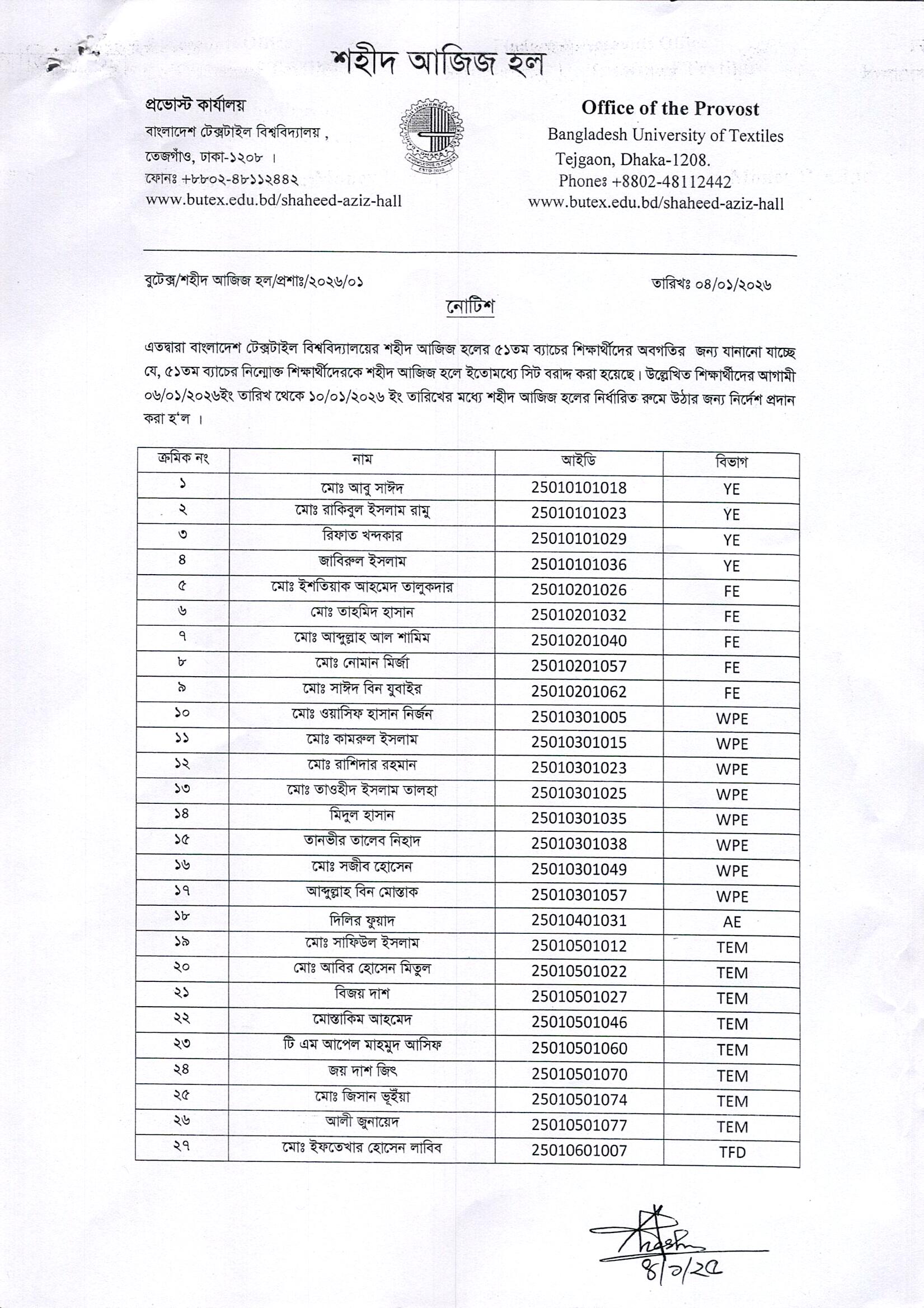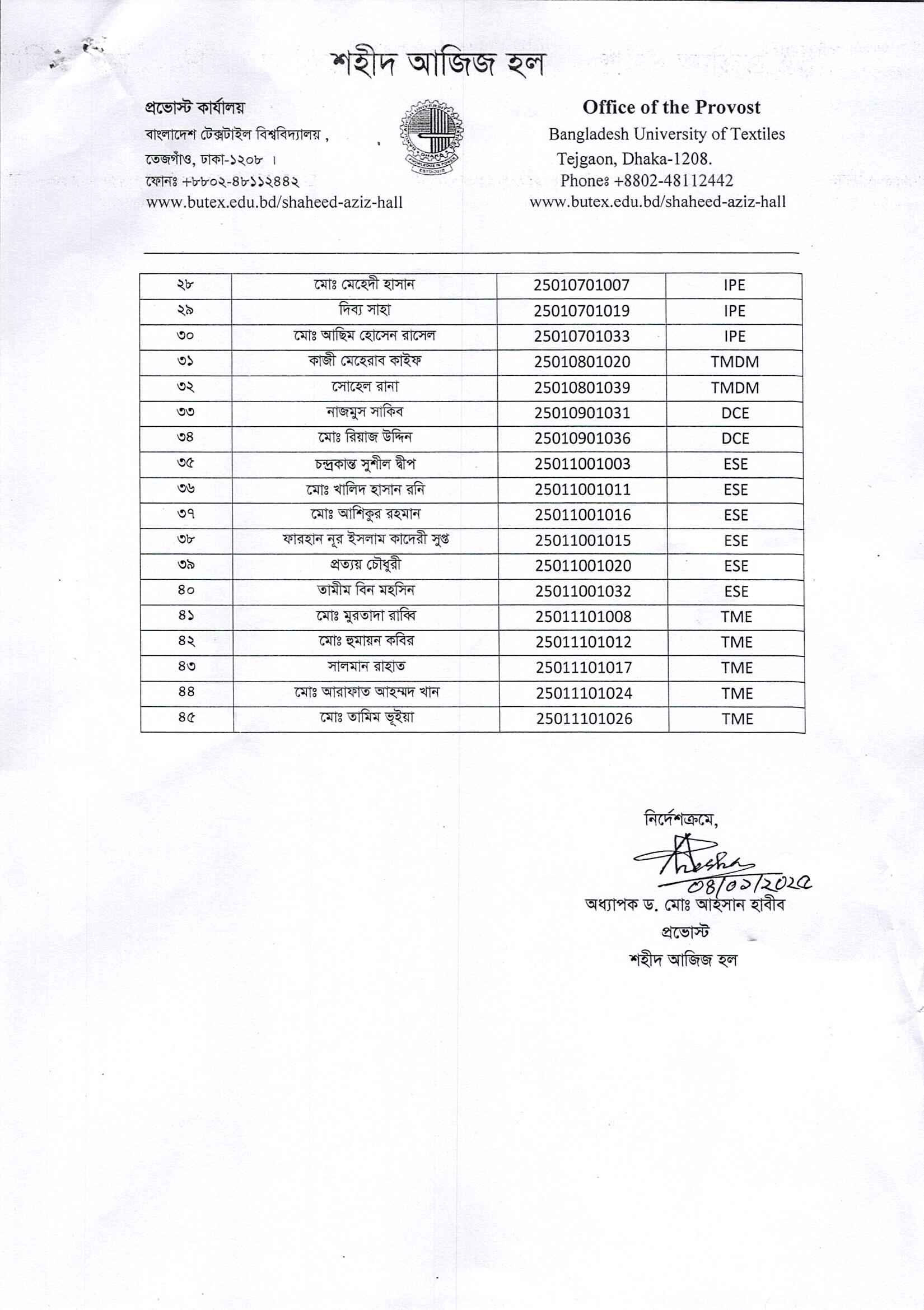 Shahid Aziz Hall: Seat Allotment Notice of 51th Batch