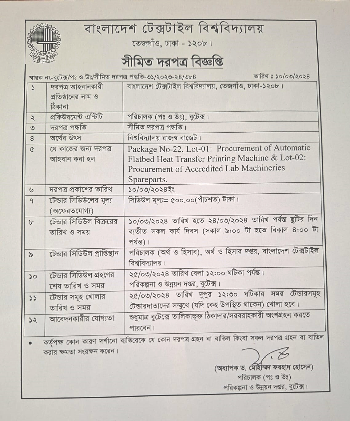 Tender Notice, Date: 10-03-2024