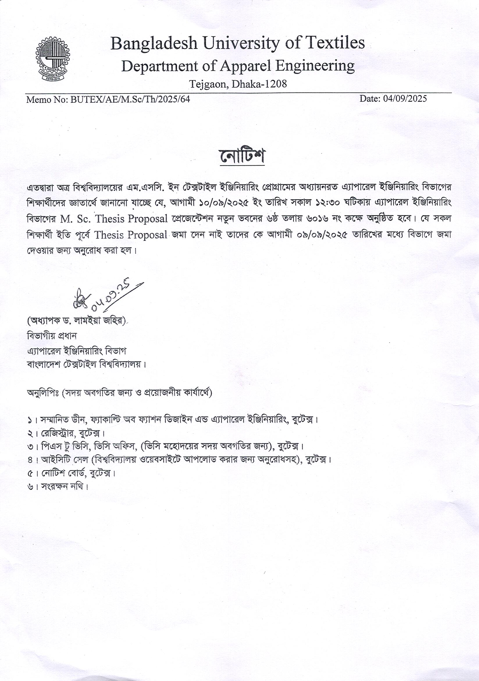 07 Sep 2025 Thesis Proposal Presentation: MSc in Textile Engineering (Apparel Dept.) Academic Notices, DAE, Postgraduate Admission News
