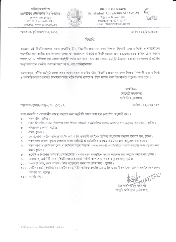 12 Jul 2023 বাংলাদেশ টেক্সটাইল বিশ্ববিদ্যালয়ে অদ্য ১২/০৭/২০২৩ তারিখ রোজ বুধবার সকাল ১১:৩০ ঘটিকায় বৃক্ষরোপণ কর্মসূচি উদ্বোধন করবেন মাননীয় উপাচার্য অধ্যাপক ড. শাহ্ আলিমুজ্জামান বাংলাদেশ টেক্সটাইল বিশ্ববিদ্যালয়ে অদ্য ১২/০৭/২০২৩ তারিখ রোজ বুধবার সকাল ১১:৩০ ঘটিকায় বৃক্ষরোপণ কর্মসূচি উদ্বোধন করবেন মাননীয় উপাচার্য অধ্যাপক ড. শাহ্ আলিমুজ্জামান Administrative Notices News Desk