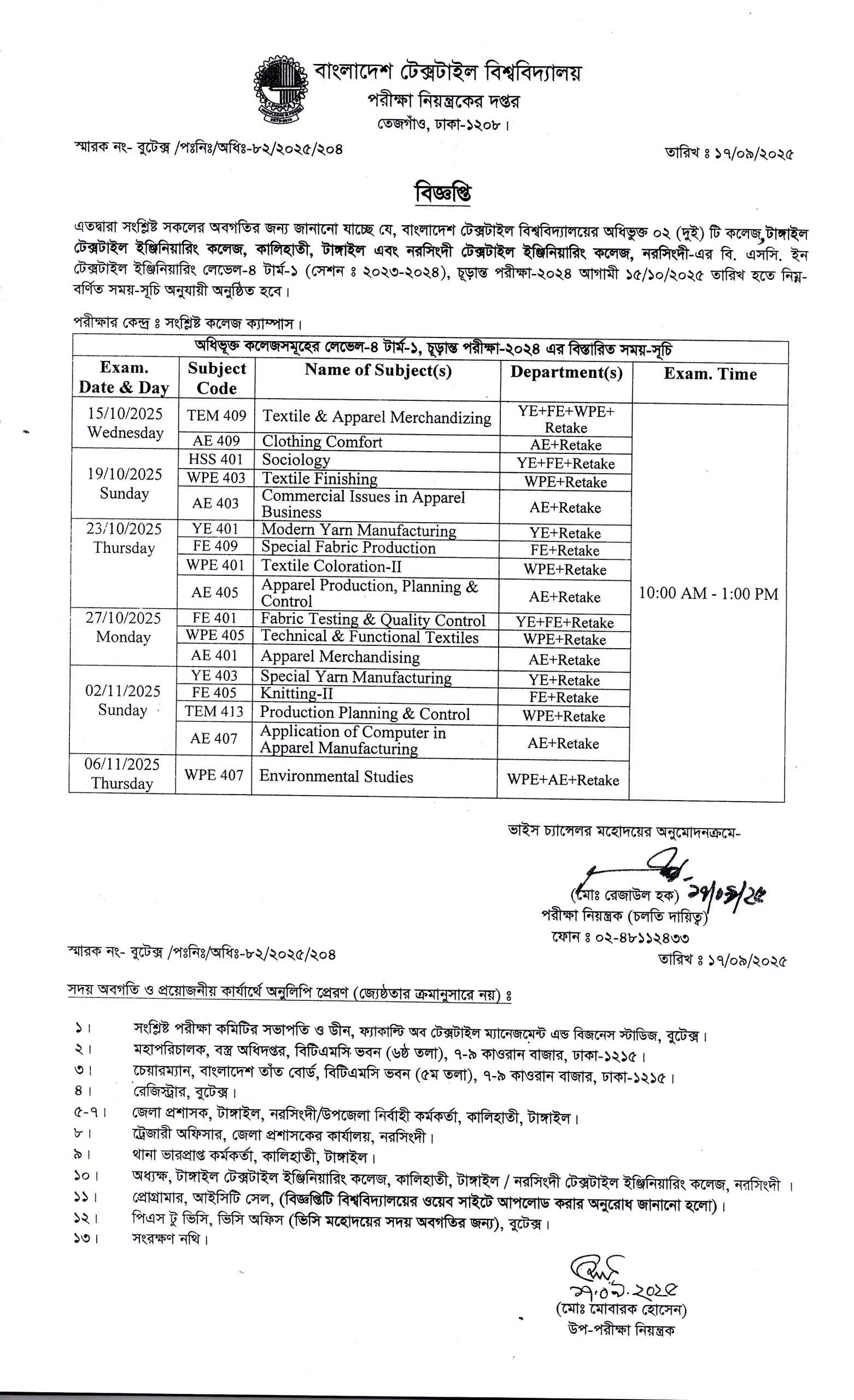 TTEC, NTEC: BSc in Textile Engineering L4-T1 Exam-2024 Schedule