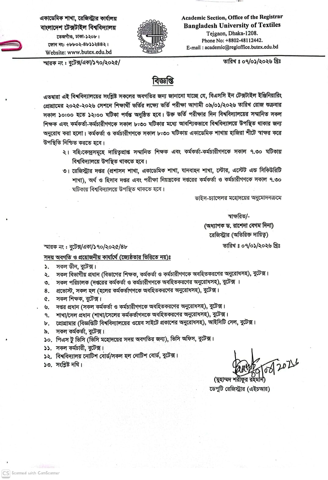 08 Jan 2026 Urgent Notice of BSc in Textile Engineering Admission Test 2025-26 Administrative Notices News Desk